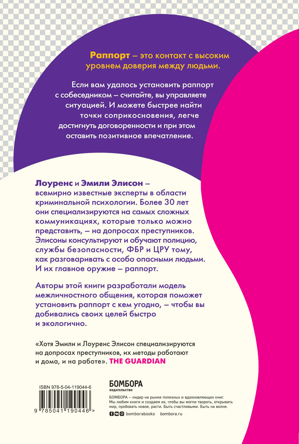 Раппорт - это контакт с высоким уровнем доверия между людьми. Если вам удалось установить раппорт с собеседником, - считайте, вы управляете ситуацией. И можете быстрее найти точки соприкосновения, легче достигнуть договоренности и оставить позитивное впечатление. Лоуренс и Эмили Элисон - всемирно известные эксперты в области криминальной психологии. Более 30 лет они специализируются на самых сложных коммуникациях, которые только можно представить: на допросах преступников. Элисоны консультируют и обучают полицию, службы безопасности, ФБР и ЦРУ тому, как обращаться с особо опасными людьми. И их главное оружие - раппорт. Авторы этой книги разработали модель межличностного общения, которая помогает устанавливать раппорт, - чтобы вы добивались своих целей быстро и экологично. Они предлагают освоить четыре универсальных стиля общения: стиль Льва (контроль), стиль Мыши (подчинение), стиль Тирранозавра (конфликт) и стиль Обезьяны (сотрудничество) - используйте эти стили в соответствущих ситуациях, чтобы достигать взаимопонимания даже с самыми сложными собеседниками.| Издательство | ООО "Издательство "Эксмо" |