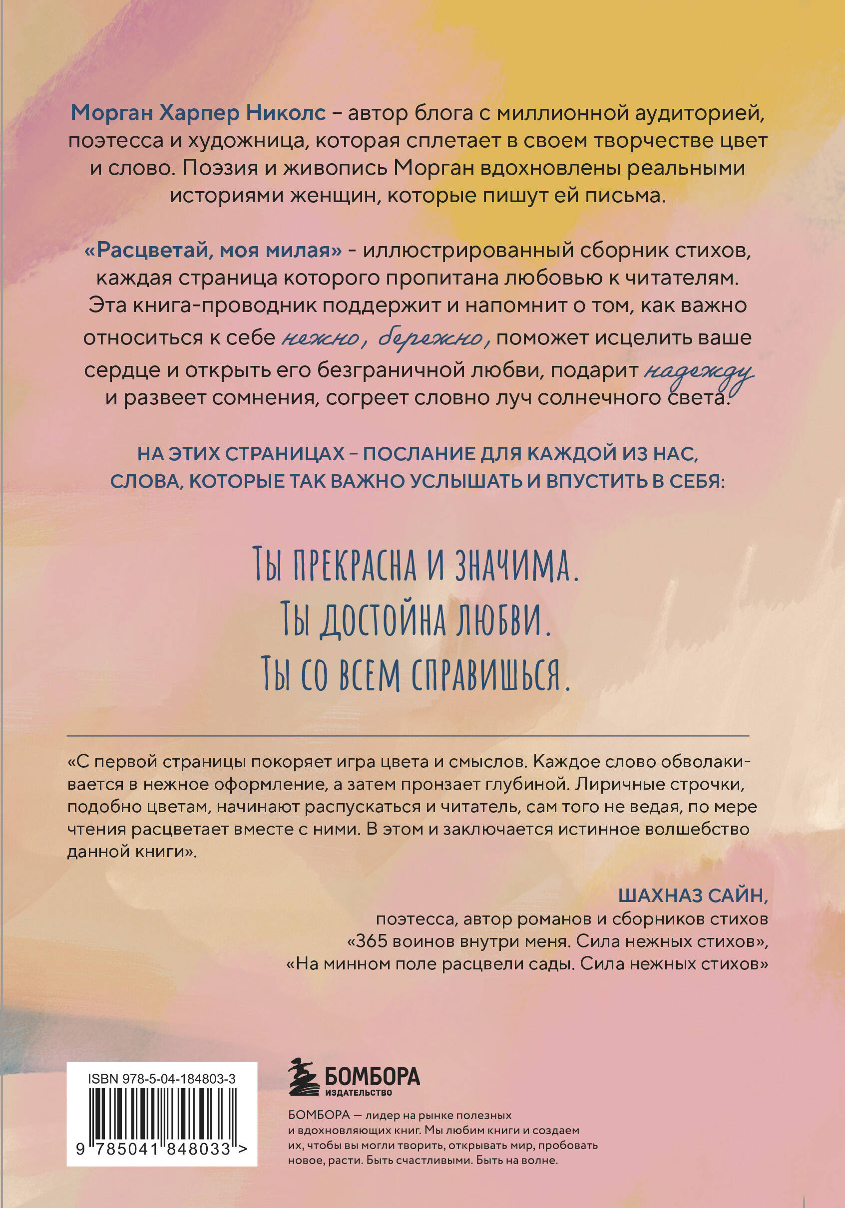 Сотни оценок на Amazon. Номинант на лучшую поэтическую книгу GOODREADS CHOICE AWARDS 2020. «Расцветай, моя милая» - иллюстрированный сборник стихов, каждая страница которого пропитана любовью к читателям. Эта книга-проводник поддержит и напомнит о том, как важно относиться к себе нежно, бережно, поможет исцелить ваше сердце и открыть его безграничной любви, подарит надежду и развеет сомнения, согреет словно луч солнечного света. На этих страницах - послание для каждой из нас, слова, которые так важно услышать и впустить в себя: «Ты прекрасна и значима. Ты достойна любви. Ты со всем справишься». Морган Харпер Николс - автор блога с миллионной аудиторией, поэтесса и художница, которая сплетает в своем творчестве цвет и слово. Поэзия и живопись Морган вдохновлены реальными историями женщин, которые пишут ей письма. «С первой страницы покоряет игра цвета и смыслов. Каждое слово обволакивается в нежное оформление, а затем пронзает глубиной. Лиричные строчки, подобно цветам, начинают распускаться, и читатель, сам того не ведая, расцветает вместе с ними. В этом и заключается истинное волшебство данной книги». - ШАХНАЗ САЙН, поэтесса, автор романов и сборников стихов «365 воинов внутри меня. Сила нежных стихов», «На минном поле расцвели сады. Сила нежных стихов»| Издательство | ООО "Издательство "Эксмо" |
