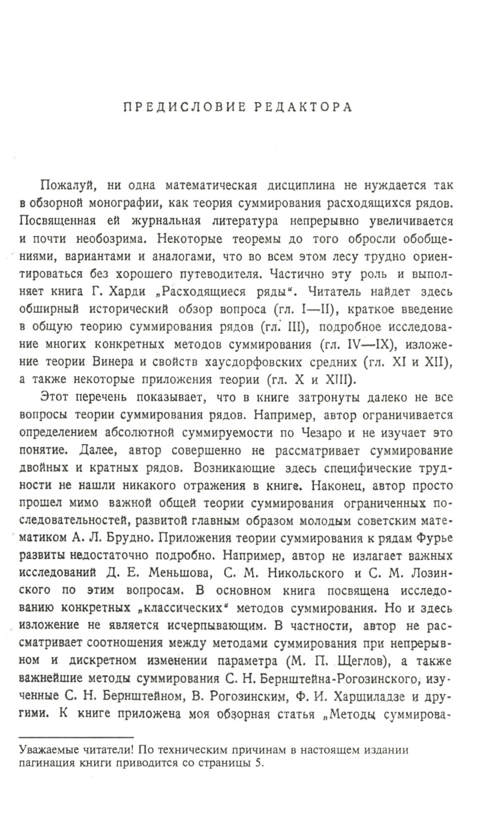Настоящая книга представляет собой монографию, посвященную суммированию расходящихся рядов. Она содержит обширный исторический обзор вопроса, краткое введение в общую теорию суммирования рядов и подробное исследование ряда конкретных методов суммирования (методов Чезаро, Абеля, Вороного, Эйлера и др.). Кроме того, здесь рассматриваются приложения теории к задаче перемножения рядов, к исследованию формулы суммирования Эйлера-Маклорена, к аналитическому продолжению функций, к суммированию рядов Фурье и к нахождению значений определенных интегралов. Книга рассчитана на математиков - научных работников, аспирантов и студентов старших курсов - и требует для своего чтения знания теории функций действительного и комплексного переменного. В некоторых своих разделах она может быть также полезна для тех инженеров, которые встречаются с расходящимися рядами.| Издательство | ЛЕНАНД |
