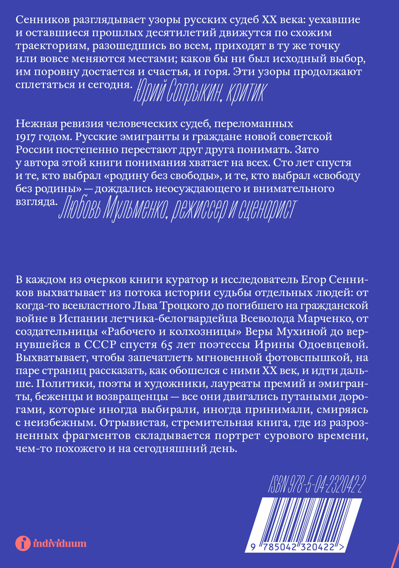 В каждом из очерков книги куратор и исследователь Егор Сенников выхватывает из потока истории судьбы отдельных людей: от когда‑то всевластного Льва Троцкого до погибшего на гражданской войне в Испании летчика-белогвардейца Всеволода Марченко, от создательницы «Рабочего и колхозницы» Веры Мухиной до вернувшейся в СССР спустя 65 лет поэтессы Ирины Одоевцевой. Выхватывает, чтобы запечатлеть мгновенной фотовспышкой, на паре страниц рассказать, как обошелся с ними XX век, и идти дальше. Политики, поэты и художники, лауреаты премий и эмигранты, беженцы и возвращенцы - все они двигались путаными дорогами, которые иногда выбирали, иногда принимали, смиряясь с неизбежным. Отрывистая, стремительная книга, где из разрозненных фрагментов складывается портрет сурового времени, чем‑то похожего и на сегодняшний день.| Издательство | ООО "Издательство "Эксмо" |
