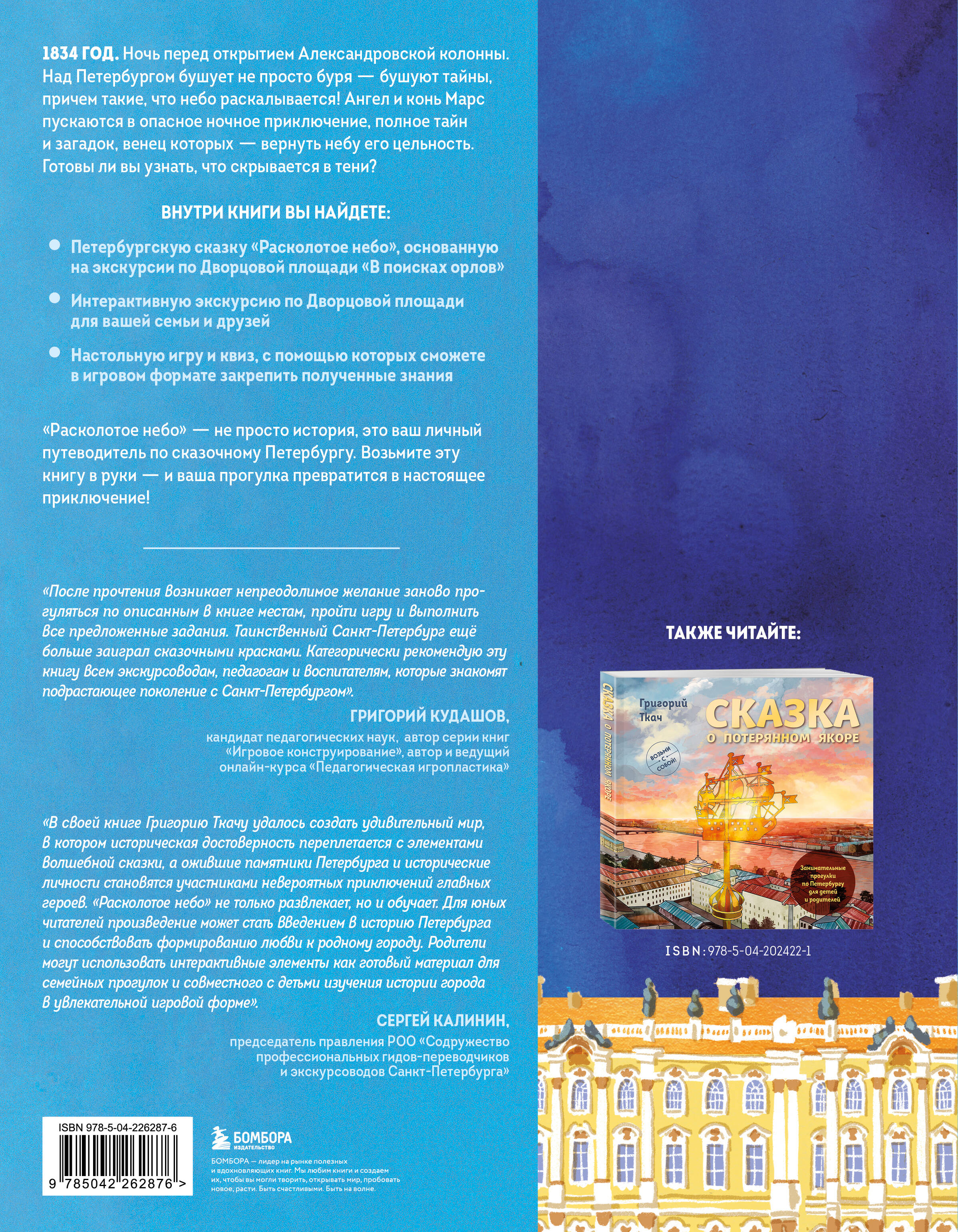 Петербург, о котором вы не подозревали, - город, где история оживает, а сказка становится реальностью. Ожившие герои Ангел и конь Марс спасают небо от разлома - и пускаются в самое настоящее путешествие по ночному Петербургу. Вы уверены, что знаете все секреты Дворцовой площади? Перед вами не просто сказка «Расколотое небо», а целый мир - волшебный. Книга поможет: • Узнать правду об обитателях чердака Зимнего дворца и таинственном кладе. • Стать экспертом по главной площади Петербурга благодаря историческим справкам. • Стать героем сказки: готовая интерактивная экскурсия с загадками и играми превратит вашу следующую прогулку по городу в настоящее приключение. • Провести вечер за интереснейшей настольной игрой и приготовить настоящую Гурьевскую кашу по старинному рецепту. Эта книга - ключ к волшебному Петербургу. Для родителей, которые хотят увлечь детей историей, для учителей и экскурсоводов, ищущих вдохновения, и для всех, кто верит, что магия скрывается на виду, в самых известных местах. Приоткройте дверцу в сказку - проведите одну ночь, полную опасностей и чудес!| Издательство | ООО "Издательство "Эксмо" |