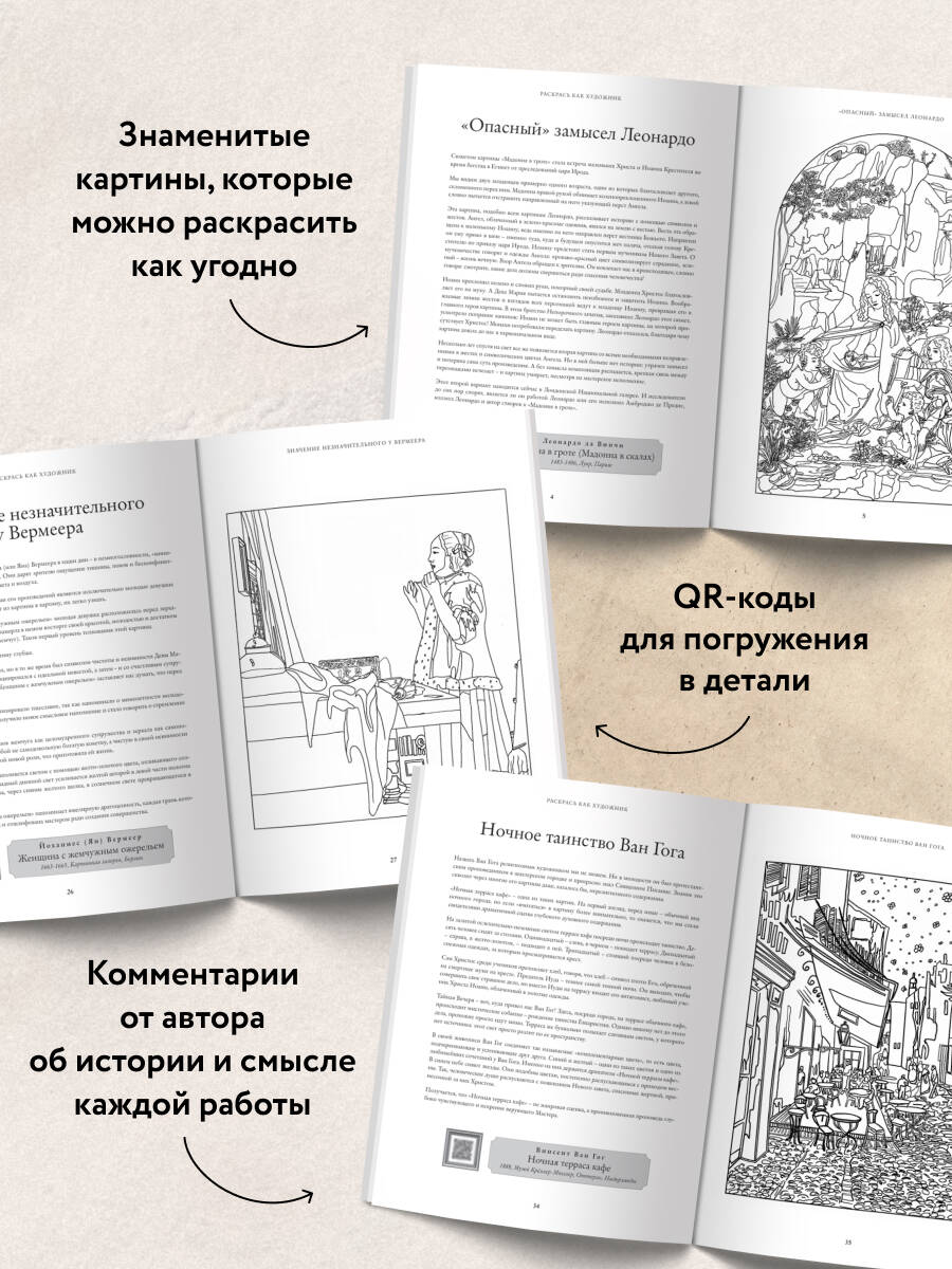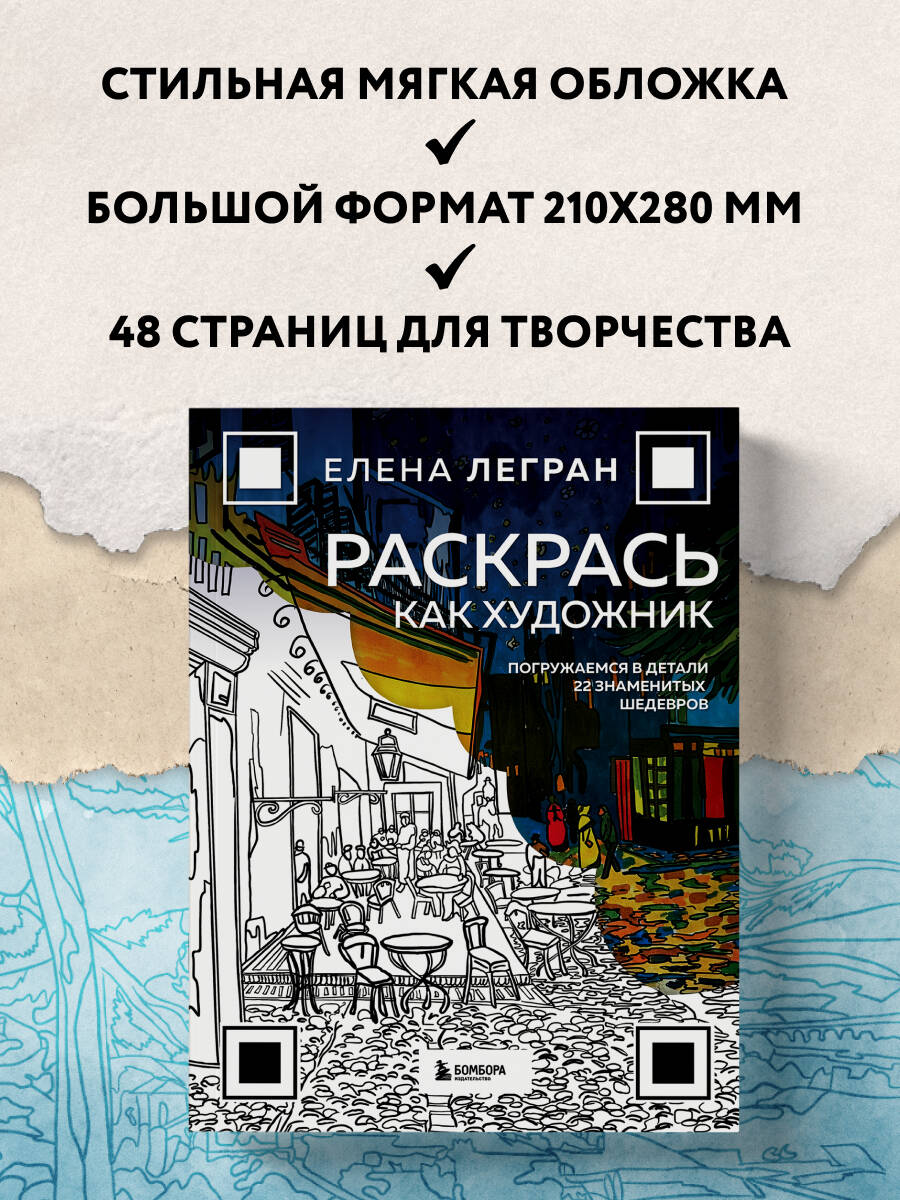 Новая раскраска «Раскрась как художник. Погружаемся в детали 22 знаменитых шедевров» предлагает уникальный опыт: возможность самому создать известные картины великих мастеров - шаг за шагом, мазок за мазком. На ее страницах собрано 22 гениальных произведения, изменивших ход мировой живописи - от Леонардо до Магритта, - и каждый шедевр здесь не просто для просмотра, а для со-творчества. Это настоящая арт-терапия и глубокое погружение в мир художественного творчества, где тексты от Елены Легран - известного искусствоведа, историка и автора книг-бестселлеров по искусству - раскроют вам секреты истории каждой картины, мотивы и вдохновение ее создателей. Используйте оригиналы картин, скрытые за QR-кодами, чтобы воссоздать их точно, или добавьте свои оттенки и смелые цвета - ведь искусство всегда живет в ваших руках!| Издательство | ООО "Издательство "Эксмо" |