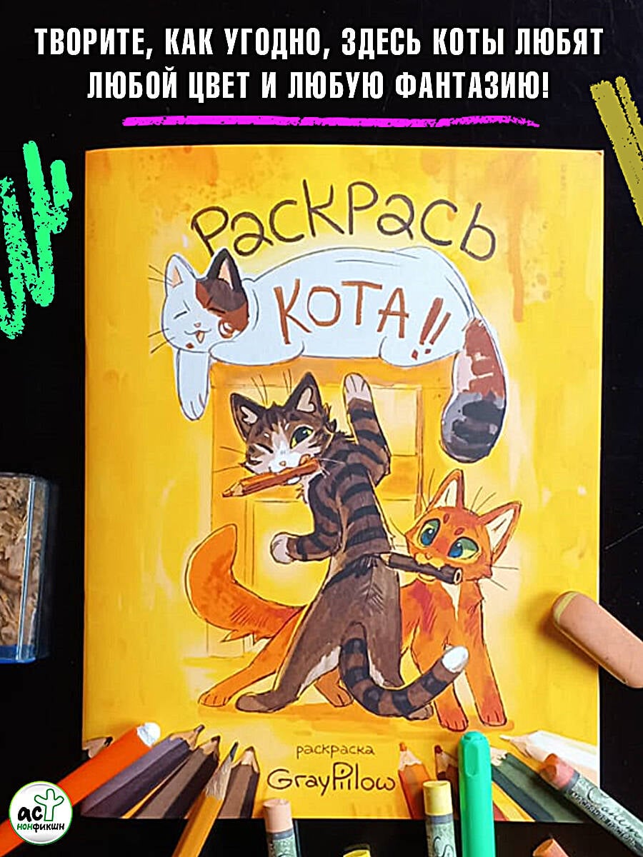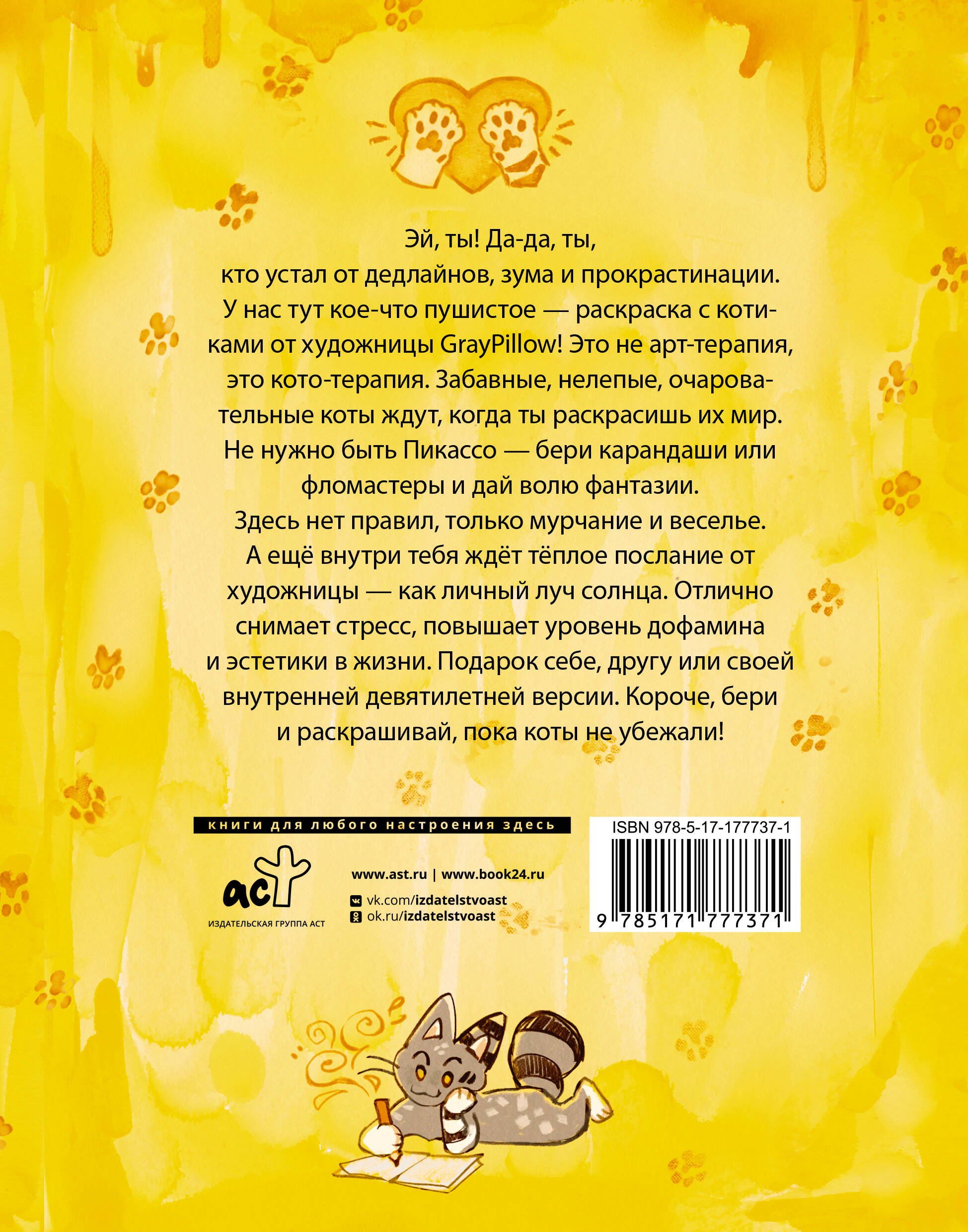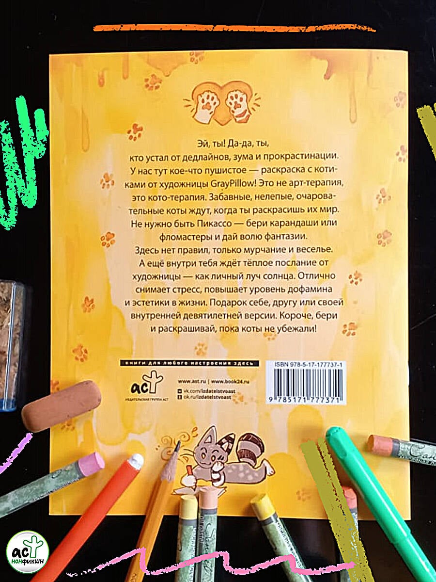 Эй, ты! Да-да, ты, кто устал от дедлайнов, зума и прокрастинации. У нас тут кое-что пушистое - раскраска с котиками от художницы GrayPillow! Это не арт-терапия, это кото-терапия. Забавные, нелепые, очаровательные коты ждут, когда ты раскрасишь их жизнь. Не нужно быть Пикассо - бери карандаши или фломастеры и дай волю фантазии. Здесь нет правил, только мурчание и веселье. А ещё внутри тебя ждёт тёплое послание от художницы - как личный луч солнца. Отлично снимает стресс, повышает уровень дофамина и эстетики в жизни. Подарок себе, другу или своей внутренней девятилетней версии. Короче, бери и раскрашивай, пока коты не убежали!| Издательство | Издательство "АСТ" |