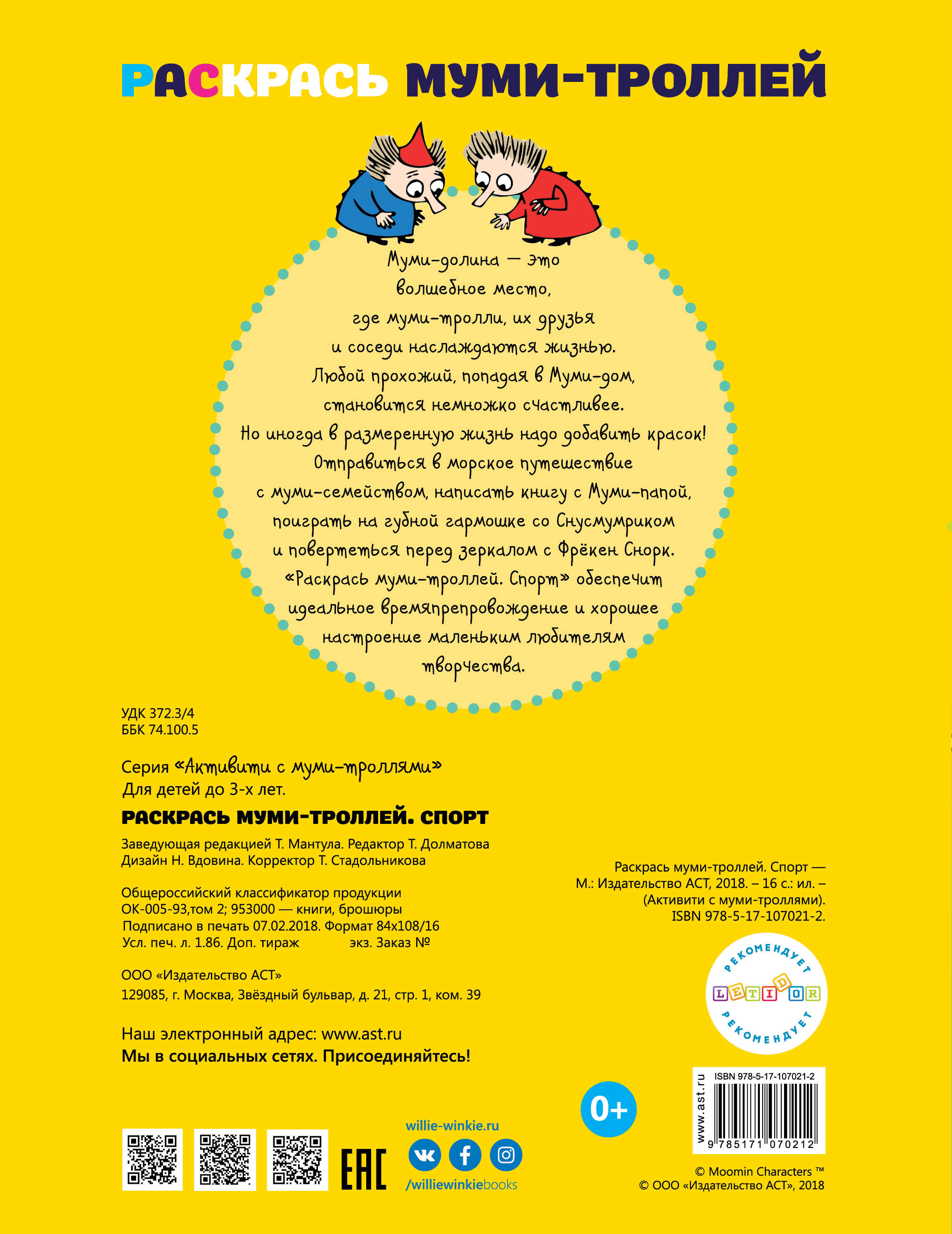 Редакция «Вилли Винки» представляет! Муми-долина - это волшебное место, где муми-тролли, их друзья и соседи наслаждаются жизнью. Любой прохожий, попадая в Муми-дом, становится немножко счастливее. Но иногда в размеренную жизнь надо добавить красок! Отправиться в морское путешествие с муми-семейством, написать книгу с Муми-папой, поиграть на губной гармошке со Снусмумриком и повертеться перед зеркалом с Фрёкен Снорк. «Раскрась муми-троллей. Спорт» обеспечит идеальное времяпрепровождение и хорошее настроение для маленьких любителей творчества.| Издательство | ИЗДАТЕЛЬСТВО "АСТ" |