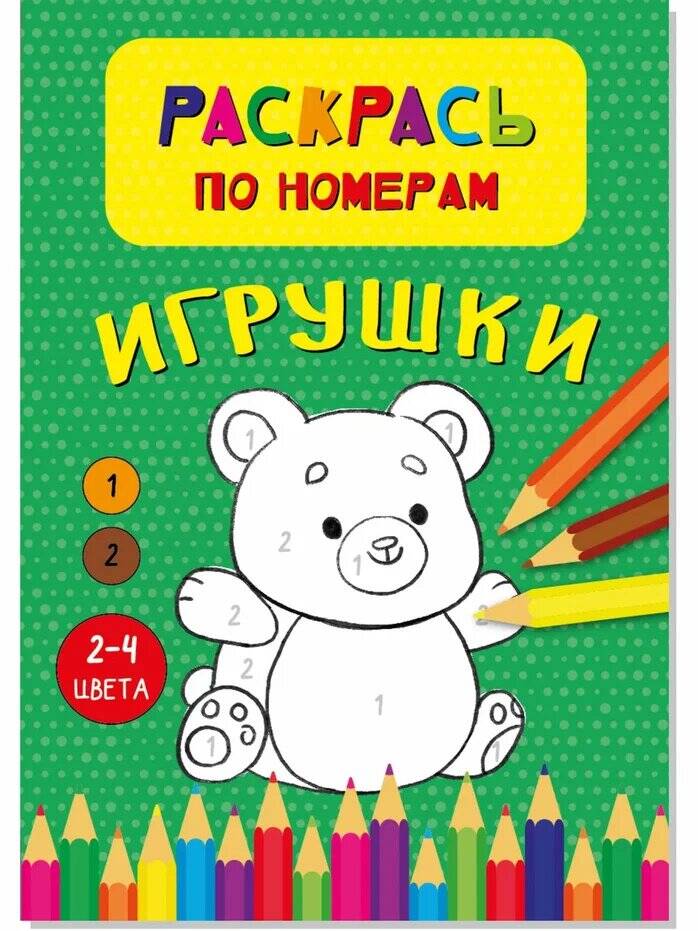 Раскраска - "Раскрась по номерам", с изображением знакомых игрушек. Предлагаем вам замечательные раскраски для малышей дошкольного возраста. Контур и номера подскажут малышу, каким цветом правильно раскрасить картинку, а толстые линии помогут ему не заезжать за края изображения. Крупные рисунки игрушек в этой книге отличаются своей простотой и отсутствием мелких деталей. Эти раскраски - отличный старт для малышей, которые только начинают учиться раскрашивать и рисовать.| Издательство | Ридер OOO |
