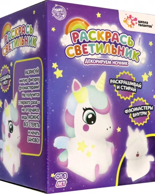 С этим набором ребёнок легко создаст светильник в виде единорожки. С помощью фломастеров ребёнок сможет погрузиться в увлекательный процесс и расписать светильник на свой вкус!