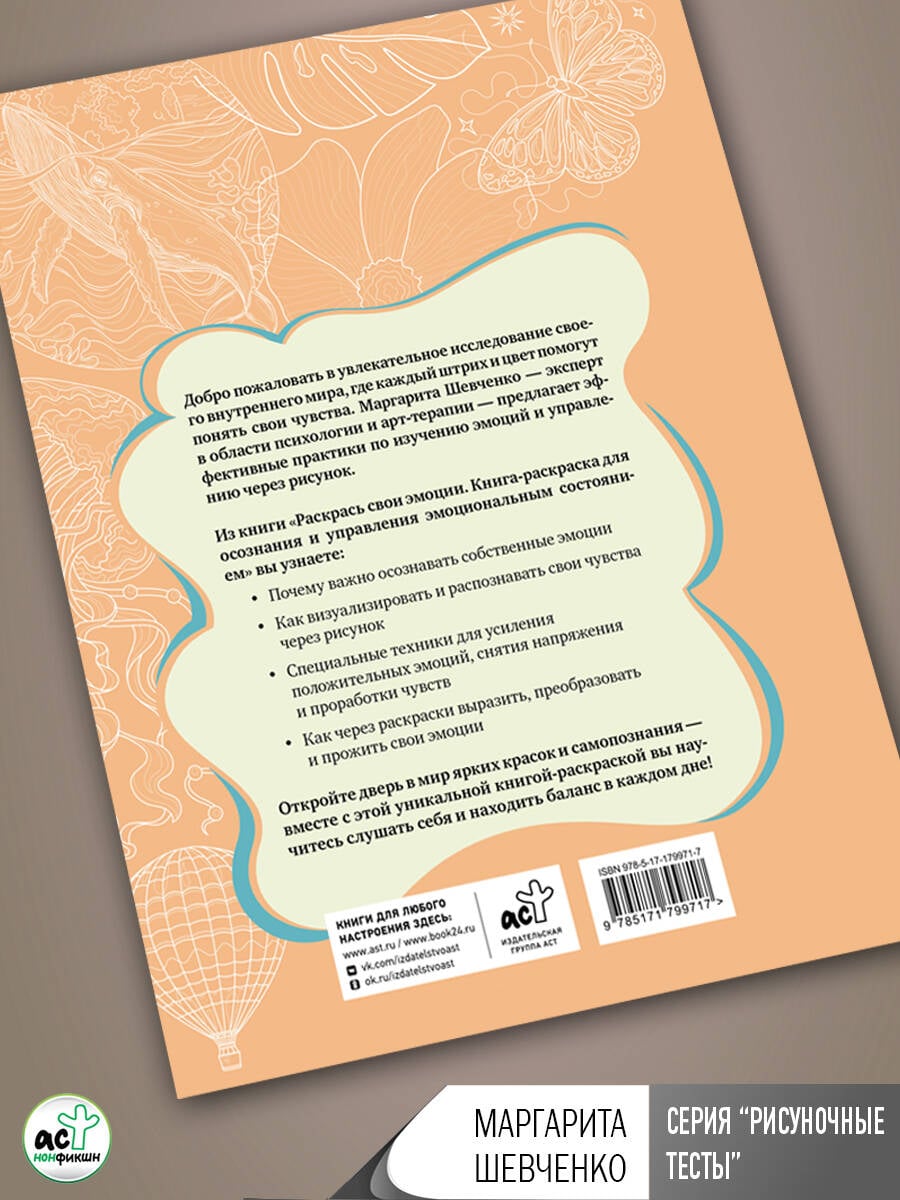 Добро пожаловать в увлекательное исследование своего внутреннего мира, где каждый штрих и цвет помогут понять свои чувства. Маргарита Шевченко - эксперт в области психологии и арт-терапии - предлагает эффективные практики по изучению эмоций и управлению ими через рисунок. Из книги "Раскрась свои эмоции. Книга-раскраска для осознания и управления эмоциональным состоянием" вы узнаете: • Почему важно осознавать собственные эмоции • Как визуализировать и распознавать свои чувства через рисунок • Специальные техники для усиления положительных эмоций, снятия напряжения и проработки чувств • Как через раскраски выразить, преобразовать и прожить свои эмоции Откройте дверь в мир ярких красок и самопознания - вместе с этой уникальной книгой-раскраской вы научитесь слушать себя и находить баланс в каждом дне!| Издательство | Издательство "АСТ" |