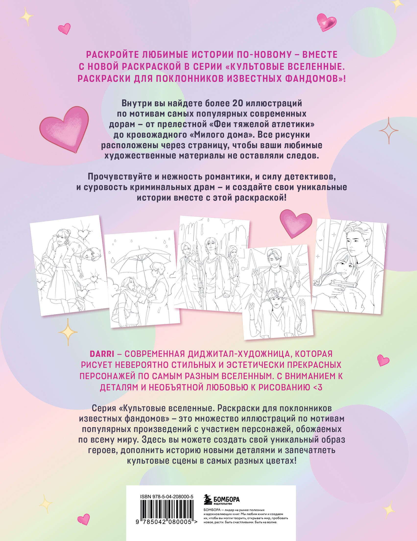 Добро пожаловать в мир корейских тайтлов, где каждый кадр наполнен эмоциями, увлекательными сюжетами и неповторимым восточным колоритом! Благодаря таланту художницы Darri вы сможете не только насладиться историей, но и добавить яркие цвета в иллюстрации, в которых отлично отражается дух популярных телесериалов. В этой раскраске вы найдете сцены, вдохновленные различными жанрами: от романтических историй до захватывающих триллеров и мрачных хорроров. Каждый разворот - это уникальное путешествие, с которым вы можете освежить воспоминания о любимых сюжетах или же открыть для себя новые: пережить историю любви наподобие легендам о Кумихо или искать убежище в разгар зомби-апокалипсиса, а может, поселиться в теле королевы Чосона или же отважиться поиграть с одноклассниками в «Мафию»? Выбор за вами ;)| Издательство | ООО "Издательство "Эксмо" |