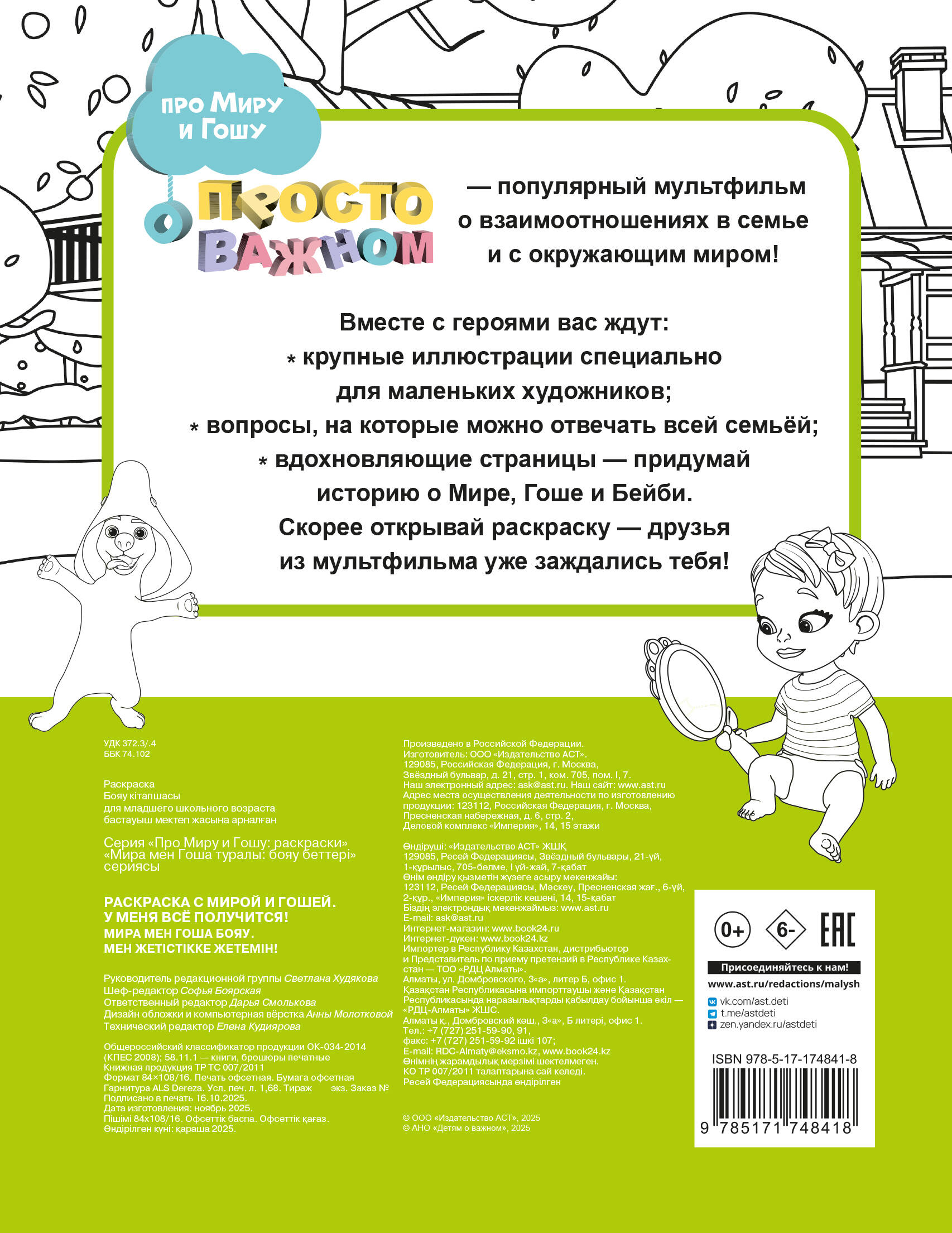 «Просто о важном» - добрый и познавательный мультфильм, который помогает детям и родителям лучше понимать друг друга. Откройте для себя мир красок и творчества вместе с любимыми героями! В этой раскраске вас ждут: · Крупные и чёткие иллюстрации с широким контуром, которые легко и приятно раскрашивать; · Интересные задания и вопросы; · Простор для фантазии: раскрась героев мультфильма так, как хочешь именно ТЫ! Погрузитесь в мир добра, любви и взаимопонимания вместе с Мирой, Гошей, Бейби и их большой дружной семьёй!| Издательство | Издательство "АСТ" |