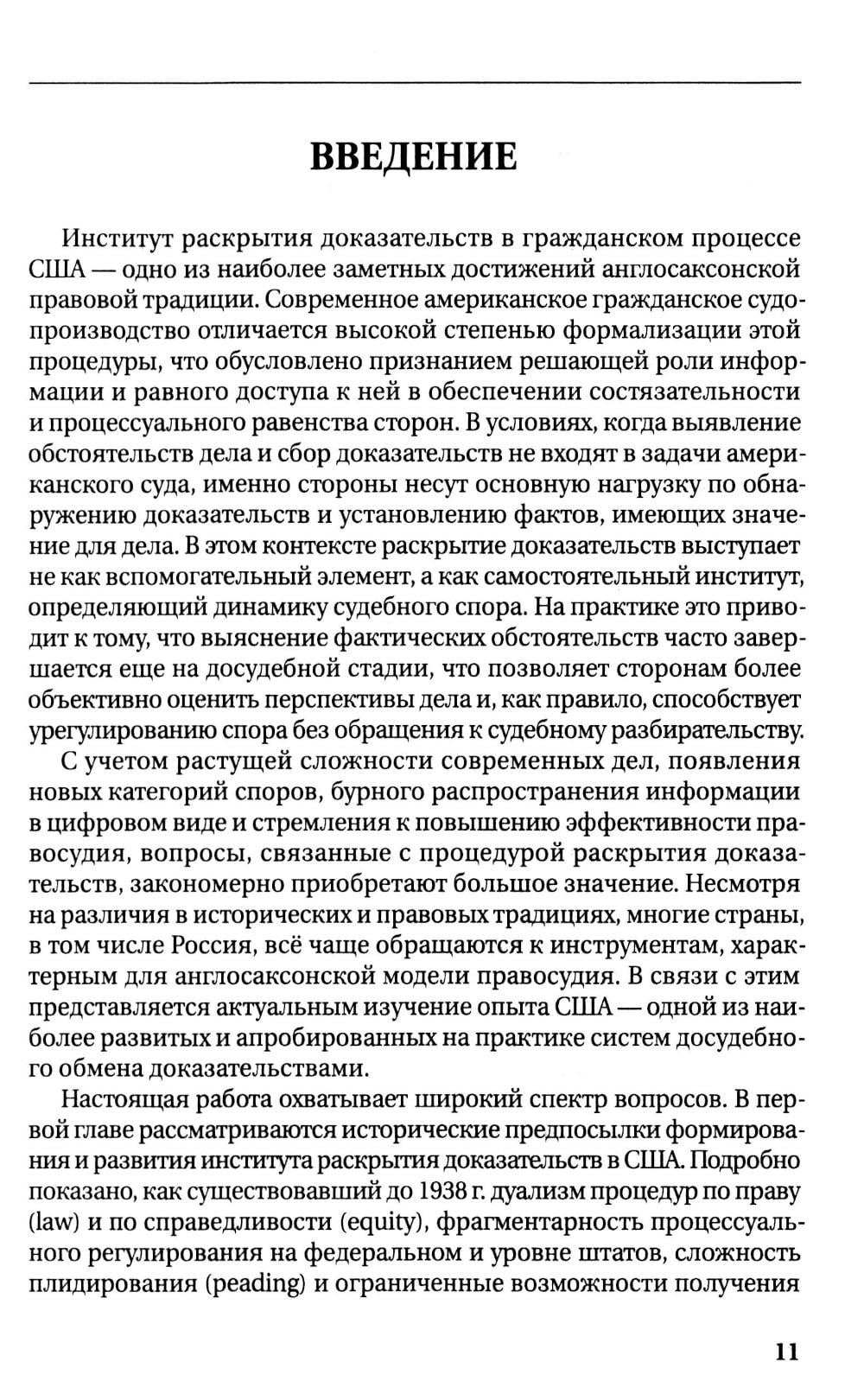 Монография посвящена исследованию института раскрытия доказательств в гражданском процессе США - одного из ключевых элементов англо-саксонской модели правосудия. Автор последовательно раскрывает исторические предпосылки и причины формирования данного института, его эволюцию от системы общего права и справедливости до принятия Федеральных правил гражданского процесса 1938 г, которые коренным образом изменили подход к досудебной подготовке дел. Работа детально анализирует современные механизмы раскрытия доказательств, включая письменные запросы, допросы под присягой, электронное раскрытие (e-discovery) и другие инструменты, а также пределы их применения, включая пропорциональность, относимость и правовые привилегии. Особое внимание уделяется сравнению американского института с континентальными системами, включая российский процесс, выявлению общих и отличительных черт, а также степени применимости американского опыта в иных правопорядках. Издание сочетает историко-правовой и сравнительно-правовой анализ, опирается на широкий круг источников - от федеральных правил и судебной практики до доктрины. Для научных работников, практикующих юристов, преподавателей и студентов, интересующихся сравнительным процессуальным правом и вопросами доказывания.| Издательство | Городец |