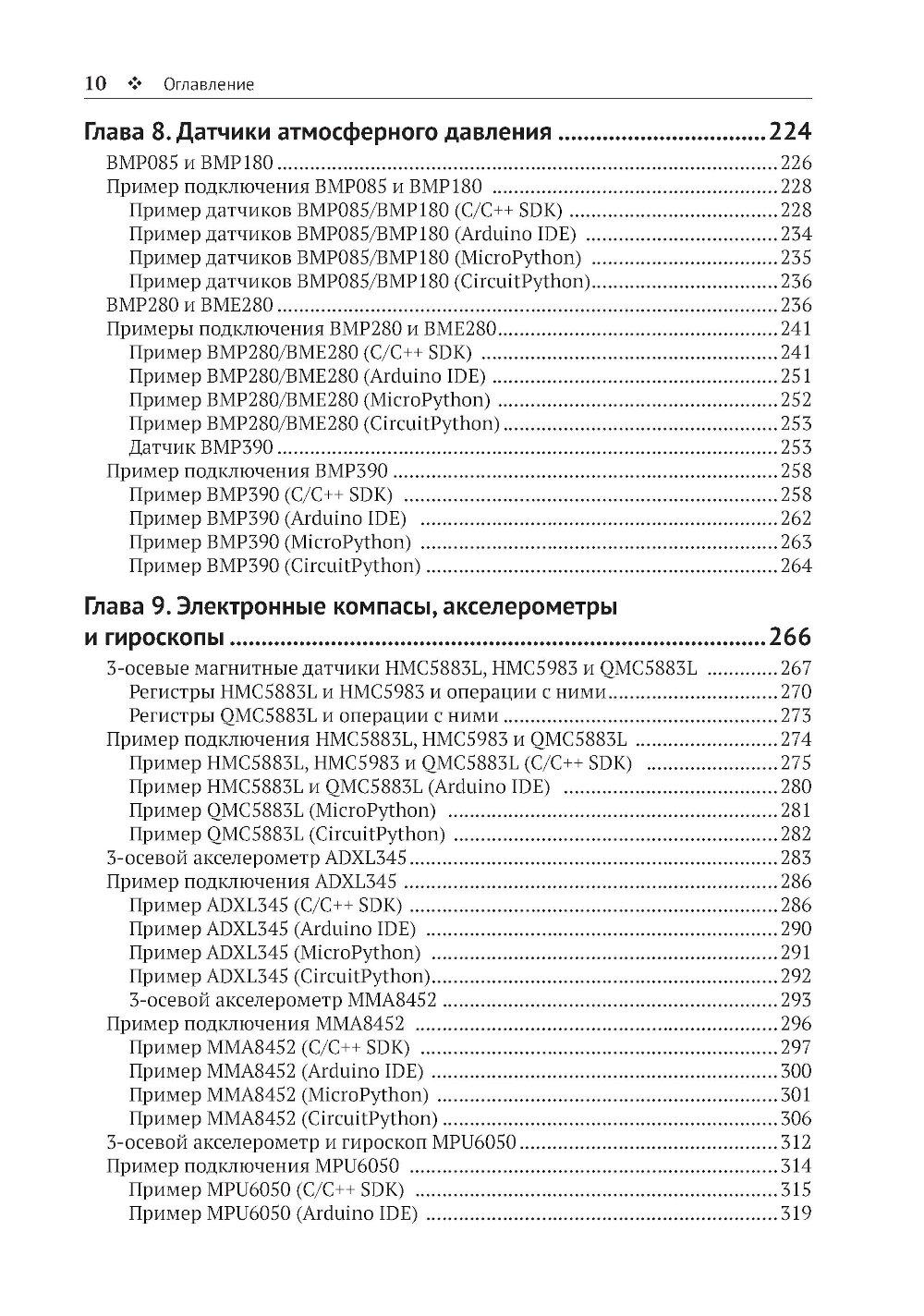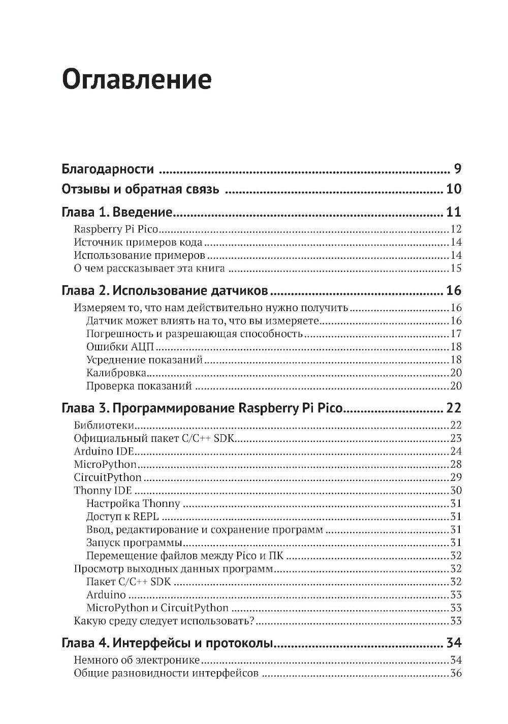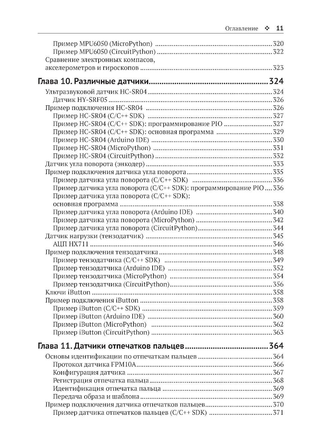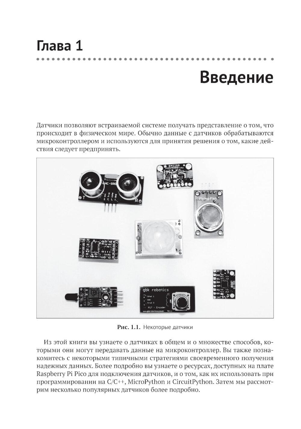 Из книги вы узнаете о современных датчиках и о множестве способов, которыми они могут передавать данные на микроконтроллер. Вы также познакомитесь с типичными стратегиями получения надежных данных, подробно изучите ресурсы, доступные на мощной и недорогой плате Raspberry Pi Pico для подключения датчиков, и научитесь использовать их при программировании на C/C++, MicroPython и CircuitPython. Основные темы книги: - программирование Raspberry Pi Pico; - распространенные интерфейсы и протоколы; - популярные цифровые датчики; - популярные аналоговые датчики; - компасы, акселерометры и гироскопы; - работа с RFID-компонентами. Издание адресовано начинающим и опытным любителям технического творчества. Предполагается, что читатель обладает базовыми знаниями C или Python. Это позволит лучше понимать примеры кода и писать на их основе собственные программы.| Издательство | ДМК Пресс |