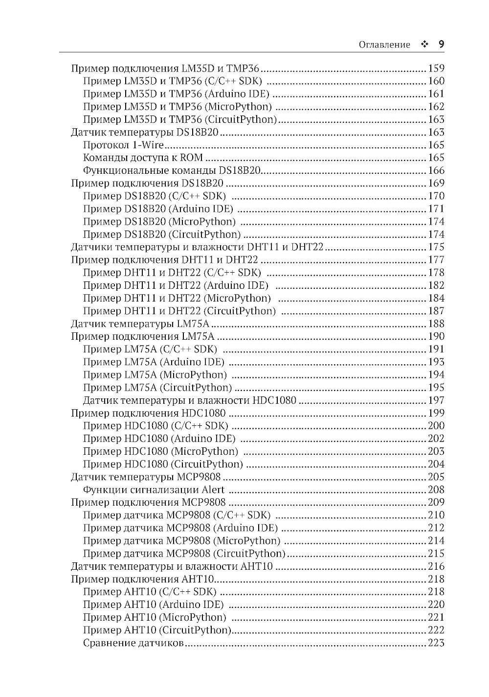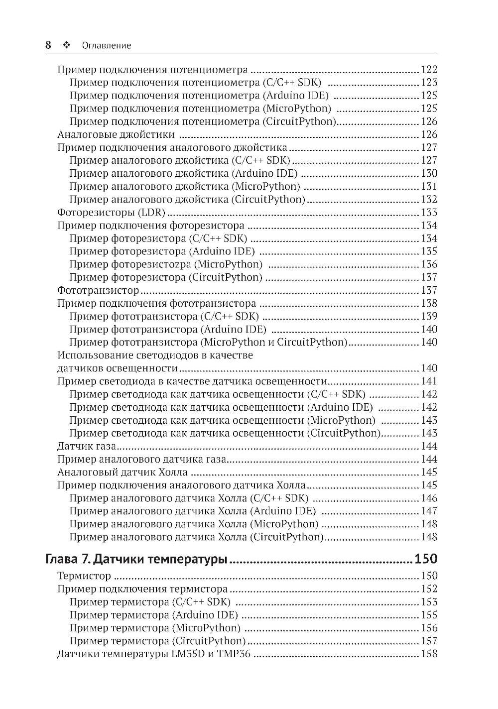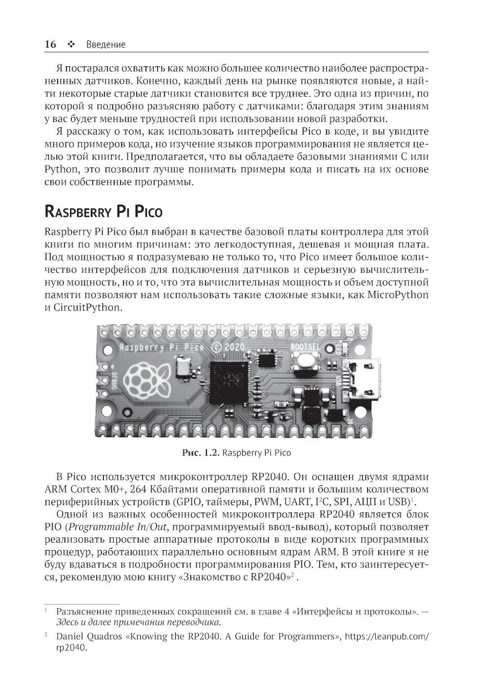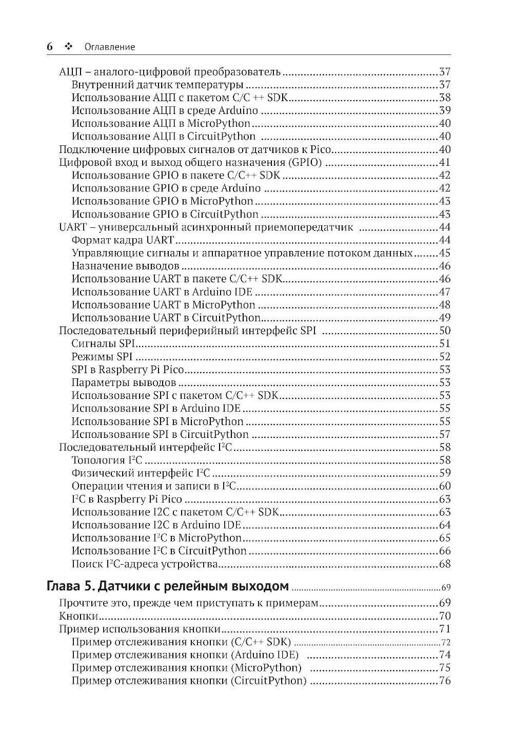 Из книги вы узнаете о современных датчиках и о множестве способов, которыми они могут передавать данные на микроконтроллер. Вы также познакомитесь с типичными стратегиями получения надежных данных, подробно изучите ресурсы, доступные на мощной и недорогой плате Raspberry Pi Pico для подключения датчиков, и научитесь использовать их при программировании на C/C++, MicroPython и CircuitPython. Основные темы книги: - программирование Raspberry Pi Pico; - распространенные интерфейсы и протоколы; - популярные цифровые датчики; - популярные аналоговые датчики; - компасы, акселерометры и гироскопы; - работа с RFID-компонентами. Издание адресовано начинающим и опытным любителям технического творчества. Предполагается, что читатель обладает базовыми знаниями C или Python. Это позволит лучше понимать примеры кода и писать на их основе собственные программы.| Издательство | ДМК Пресс |