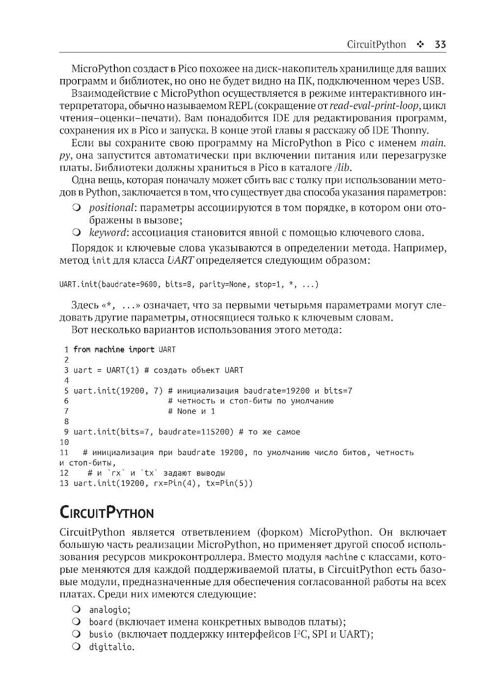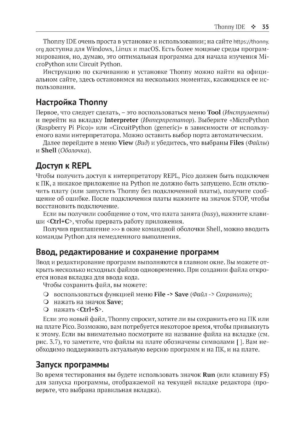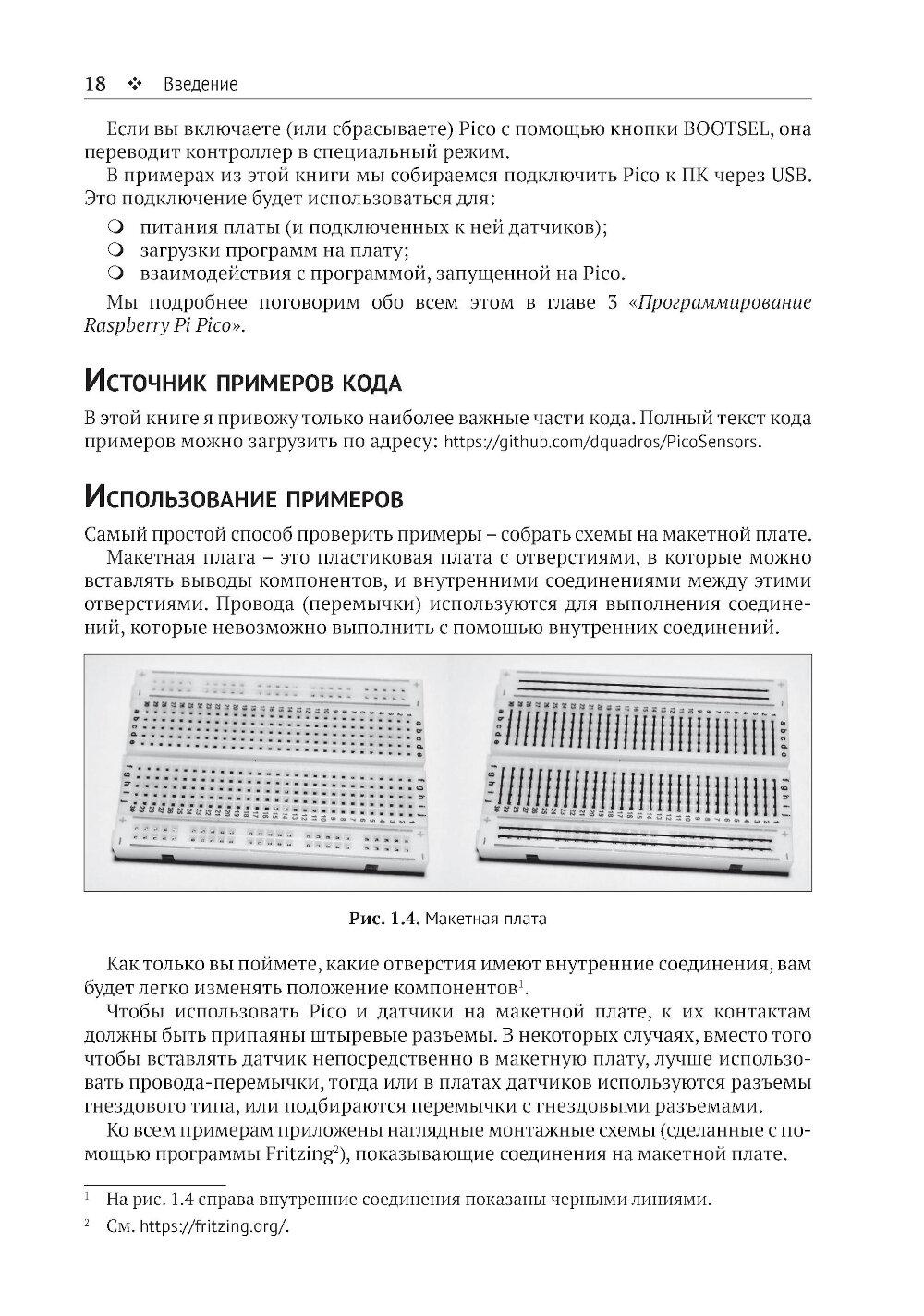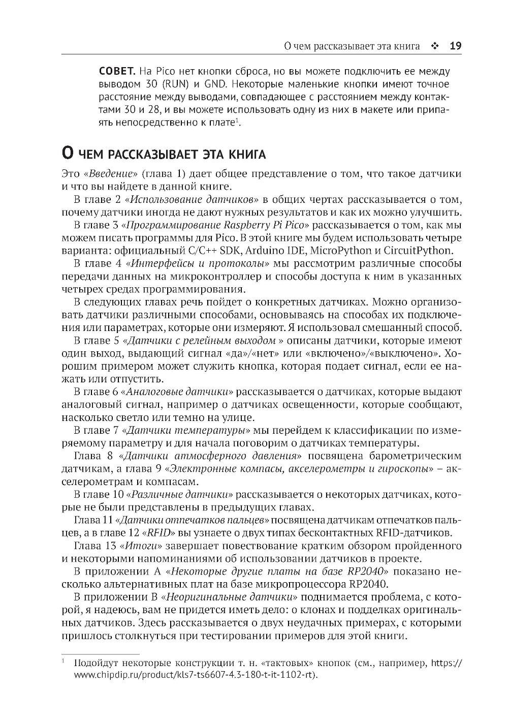 Из книги вы узнаете о современных датчиках и о множестве способов, которыми они могут передавать данные на микроконтроллер. Вы также познакомитесь с типичными стратегиями получения надежных данных, подробно изучите ресурсы, доступные на мощной и недорогой плате Raspberry Pi Pico для подключения датчиков, и научитесь использовать их при программировании на C/C++, MicroPython и CircuitPython. Основные темы книги: - программирование Raspberry Pi Pico; - распространенные интерфейсы и протоколы; - популярные цифровые датчики; - популярные аналоговые датчики; - компасы, акселерометры и гироскопы; - работа с RFID-компонентами. Издание адресовано начинающим и опытным любителям технического творчества. Предполагается, что читатель обладает базовыми знаниями C или Python. Это позволит лучше понимать примеры кода и писать на их основе собственные программы.| Издательство | ДМК Пресс |