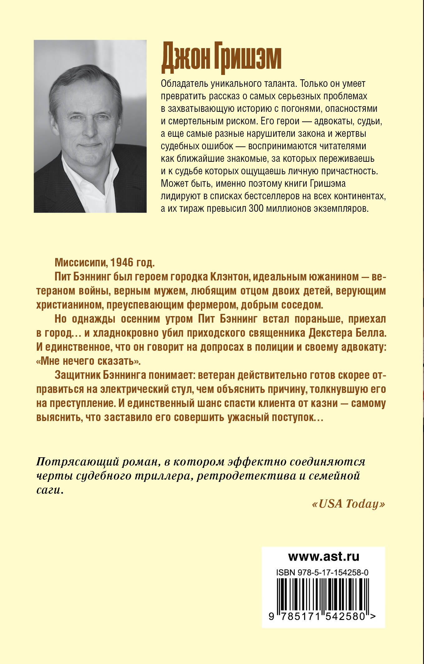 Миссисипи, 1946 год. Пит Бэннинг был героем городка Клэнтон, идеальным южанином - ветераном войны, верным мужем, любящим отцом двоих детей, верующим христианином, преуспевающим фермером, добрым соседом. Но однажды осенним утром Пит Бэннинг встал пораньше, приехал в город… и хладнокровно убил приходского священника Декстера Белла. И единственное, что он говорит на допросах в полиции и своему адвокату: "Мне нечего сказать". Защитник Бэннинга понимает: ветеран действительно готов скорее отправиться на электрический стул, чем объяснить причину, толкнувшую его на преступление. И единственный шанс спасти клиента от казни - самому выяснить, что заставило его совершить ужасный поступок…| Издательство | ИЗДАТЕЛЬСТВО "АСТ" |