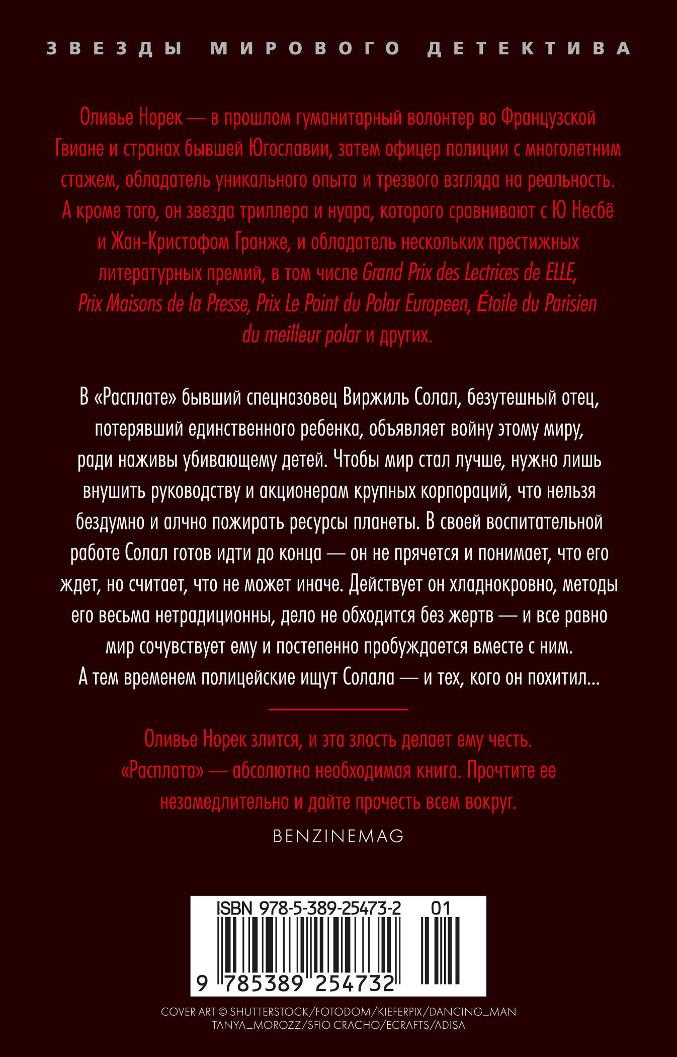 Оливье Норек - в прошлом гуманитарный волонтер во Французской Гвиане и странах бывшей Югославии, затем офицер полиции с многолетним стажем, обладатель уникального опыта, трезвого взгляда на реальность и замечательной чуткости к людям и миру. А кроме того, он звезда триллера и нуара, которого сравнивают с Ю Несбё и Жан-Кристофом Гранже, и обладатель нескольких престижных литературных премий, в том числе Grand Prix des Lectrices de ELLE, Prix Maisons de la Presse, Prix Le Point du Polar Européen, Étoile du Parisien du meilleur polar и других. В "Расплате" бывший спецназовец Виржиль Солал, безутешный отец, потерявший единственного ребенка, объявляет войну этому миру, ради наживы убивающему детей - убивающему всех без разбора. Чтобы мир стал лучше, нужно, в общем-то, немного - всего лишь внушить руководству и акционерам крупных корпораций, что нельзя бездумно пожирать ресурсы планеты ради непомерных доходов. В своей воспитательной работе Солал готов идти до конца - он не прячется и понимает, что его ждет, но считает, что не может иначе. Действует он хладнокровно, методы его весьма нетрадиционны, дело, увы, не обходится без жертв - и все равно мир сочувствует ему и постепенно пробуждается вместе с ним. А тем временем полицейские ищут Солала - и тех, кого он похитил.| Издательство | Азбука-Аттикус Издат.группа ООО |