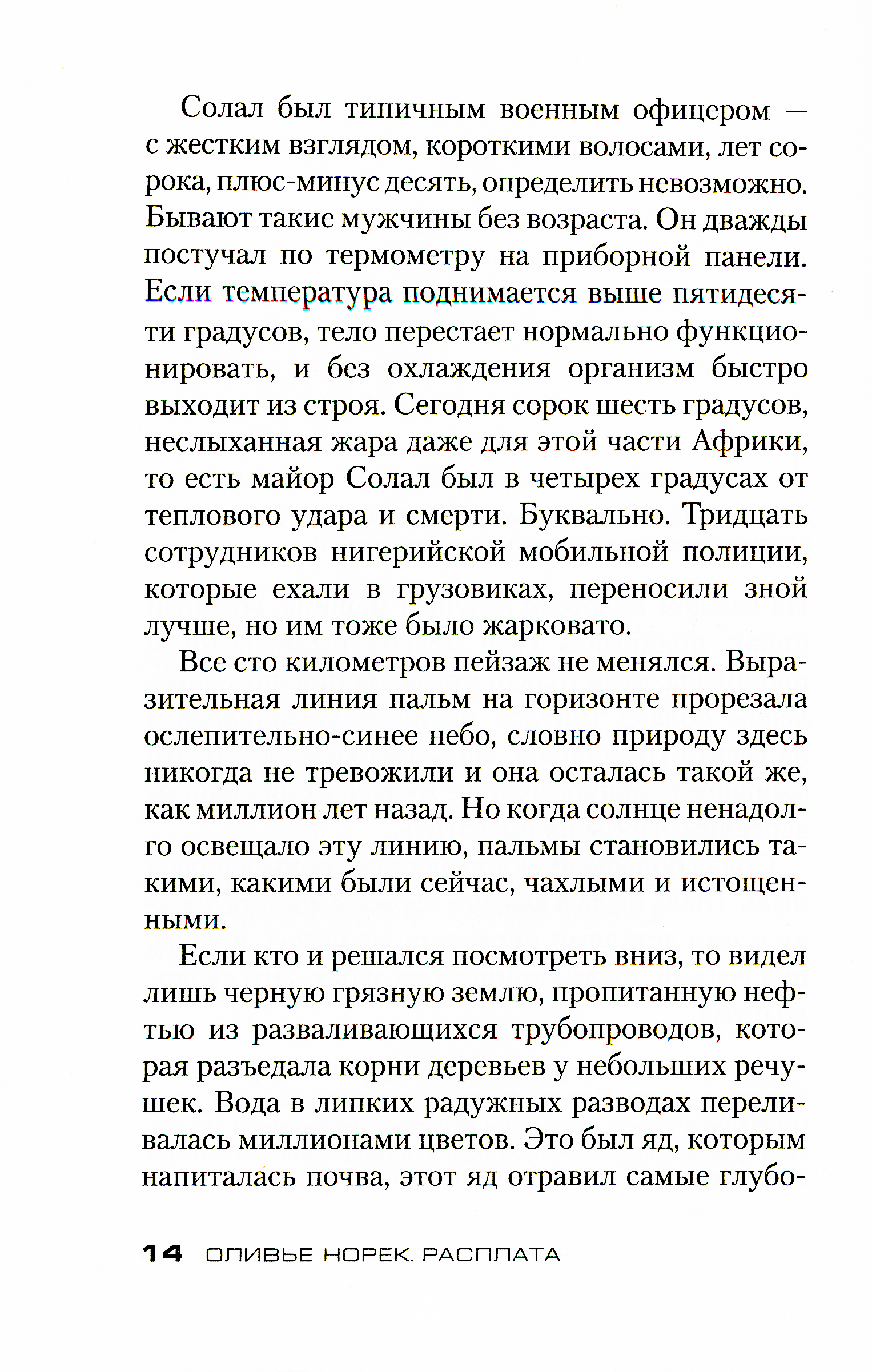 Оливье Норек - в прошлом гуманитарный волонтер во Французской Гвиане и странах бывшей Югославии, затем офицер полиции с восемнадцатилетним стажем, обладатель уникального опыта и трезвого взгляда на реальность. А кроме того, он звезда нуара, которого сравнивают с Ю Несбё и Жан-Кристофом Гранже, и обладатель нескольких престижных литературных премий, в том числе Prix Maisons de la Presse, Prix du polar europeen, Etoile du Parisien du meilleur polar и других. В новом романе Норека «Расплата» бывший спецназовец Виржиль Солал, безутешный отец, потерявший единственного ребенка, объявляет войну этому миру, ради наживы убивающему детей - убивающему всех без разбора. Чтобы мир стал лучше, нужно, в общем-то, немного - всего лишь внушить руководству и акционерам крупных корпораций, что нельзя бездумно пожирать ресурсы планеты ради непомерных доходов. В своей воспитательной работе Солал готов идти до конца - он не прячется и понимает, что его ждет, но считает, что не может иначе. Действует он хладнокровно, методы его весьма нетрадиционны, дело, увы, не обходится без жертв - и все равно мир сочувствует ему и постепенно пробуждается вместе с ним. А тем временем полицейские ищут Солала - и тех, кого он похитил…| Издательство | Азбука |