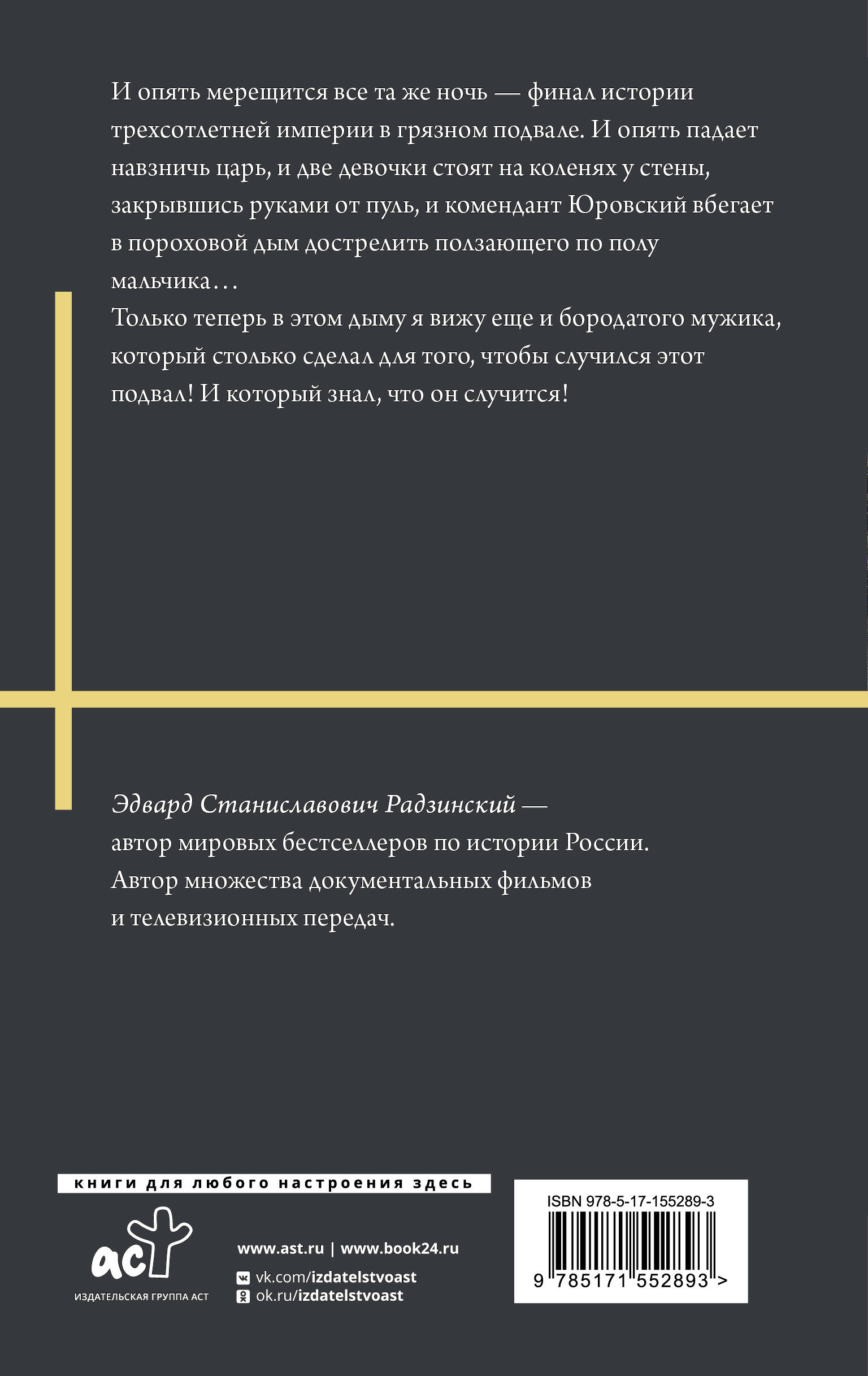 И опять мерещится все та же ночь - финал истории трехсотлетней империи в грязном подвале. И опять падает навзничь царь, и две девочки стоят на коленях у стены, закрывшись руками от пуль, и комендант Юровский вбегает в пороховой дым дострелить ползающего по полу мальчика… Только теперь в этом дыму я вижу еще и бородатого мужика, который столько сделал для того, чтобы случился этот подвал! И который знал, что он случится!| Издательство | ИЗДАТЕЛЬСТВО "АСТ" |