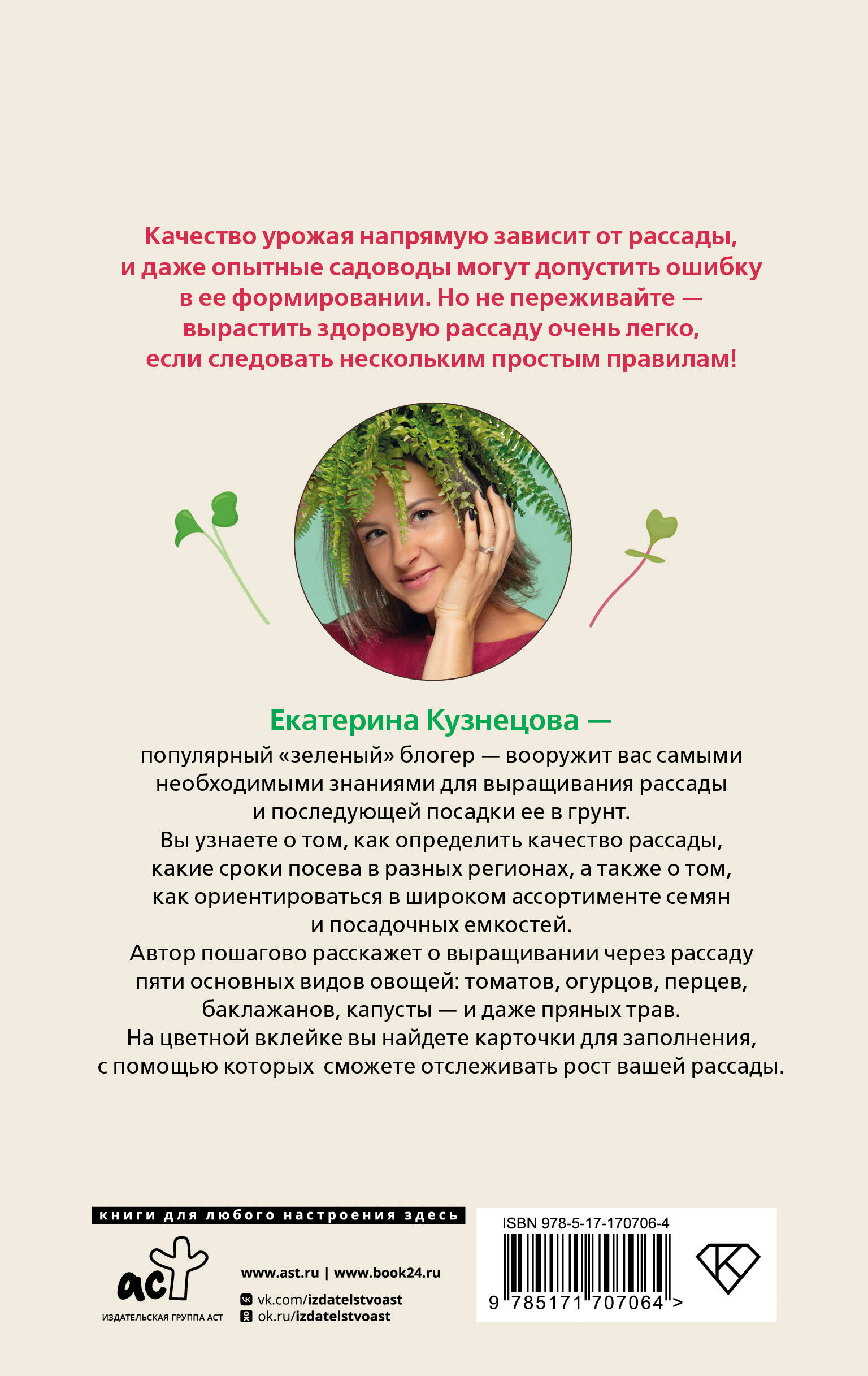 Качество урожая напрямую зависит от рассады, и даже опытные садоводы могут допустить ошибку в ее формировании. Но не переживайте - вырастить здоровую рассаду очень легко, если следовать нескольким простым правилам! И эта книга поможет вам не допустить бабушкиных ошибок, передаваемых из поколения в поколение. Екатерина Кузнецова - популярный "зеленый" блогер - вооружит вас самыми необходимыми знаниями для выращивания рассады и последующей посадки ее в грунт. Вы узнаете о том, как определить качество рассады, какие сроки посева в разных регионах, а также о том, как ориентироваться в широком ассортименте семян и посадочных емкостей. Автор пошагово расскажет о выращивании через рассаду пяти основных видов овощей: томатов, огурцов, перцев, баклажанов, капусты - и даже пряных трав. А на цветной вклейке вы найдете карточки для заполнения, с помощью которых сможете отслеживать рост вашей рассады.| Издательство | Издательство "АСТ" |