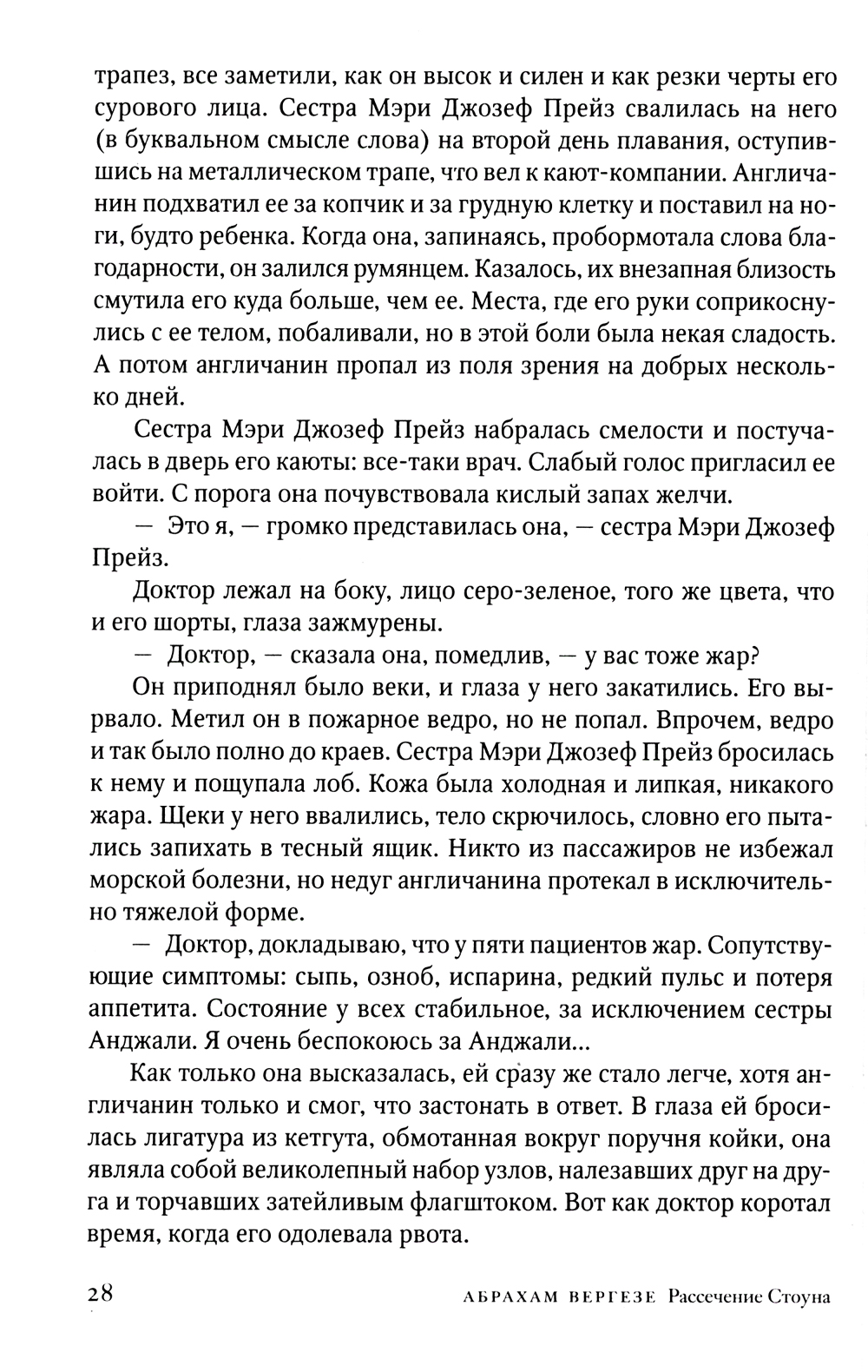 «Рассечение Стоуна» - история любви длиною в жизнь, история предательства и искупления, человеческой слабости и силы духа, изгнания и долгого возвращения домой. В миссионерской больнице Аддис-Абебы при трагических, истинно шекспировских обстоятельствах рождаются два мальчика, два близнеца, сросшихся затылками, Мэрион и Шива. Рожденные прекрасной индийской монахиней, мальчики осиротели, едва успев появиться на свет. Искусство и мужество врачей, разделивших их сразу после рождения, определили их предназначение. Мэрион и Шива свяжут свое будущее с медициной, но каждый пойдет своей дорогой. Их ждет удивительная, трагическая и полная невероятных событий судьба. Абсолютно счастливое детство и драматическая юность, поиски себя и своих корней, поиски отца, предательство и страстное желание искупить вину, любовь, похожая на наваждение, и ревность, изъедающая душу. И все это под сенью медицины, составляющей суть жизни каждого. Что бы ни происходило с героями этого воистину большого романа, какие бы терзания ни довелось испытать , главным для них всегда оставалась хирургия - дело, ради которого они пришли в этот мир. Абрахам Вергезе - выдающий доктор, профессор Стэнфордского университета, прошедший, подобно своим героям, через все стадии становления врача, порой в очень сложных условиях. Его роман «Рассечение Стоуна», впервые вышедший полтора десятка лет назад, сейчас уже по праву считается классикой. Удивительная проникновенность и достоверность, глубочайшее знание профессии и великолепный литературный стиль позволяют назвать книгу Вергезе одним из самых значительных медицинских романов последнего столетия.| Издательство | Фантом Пресс |