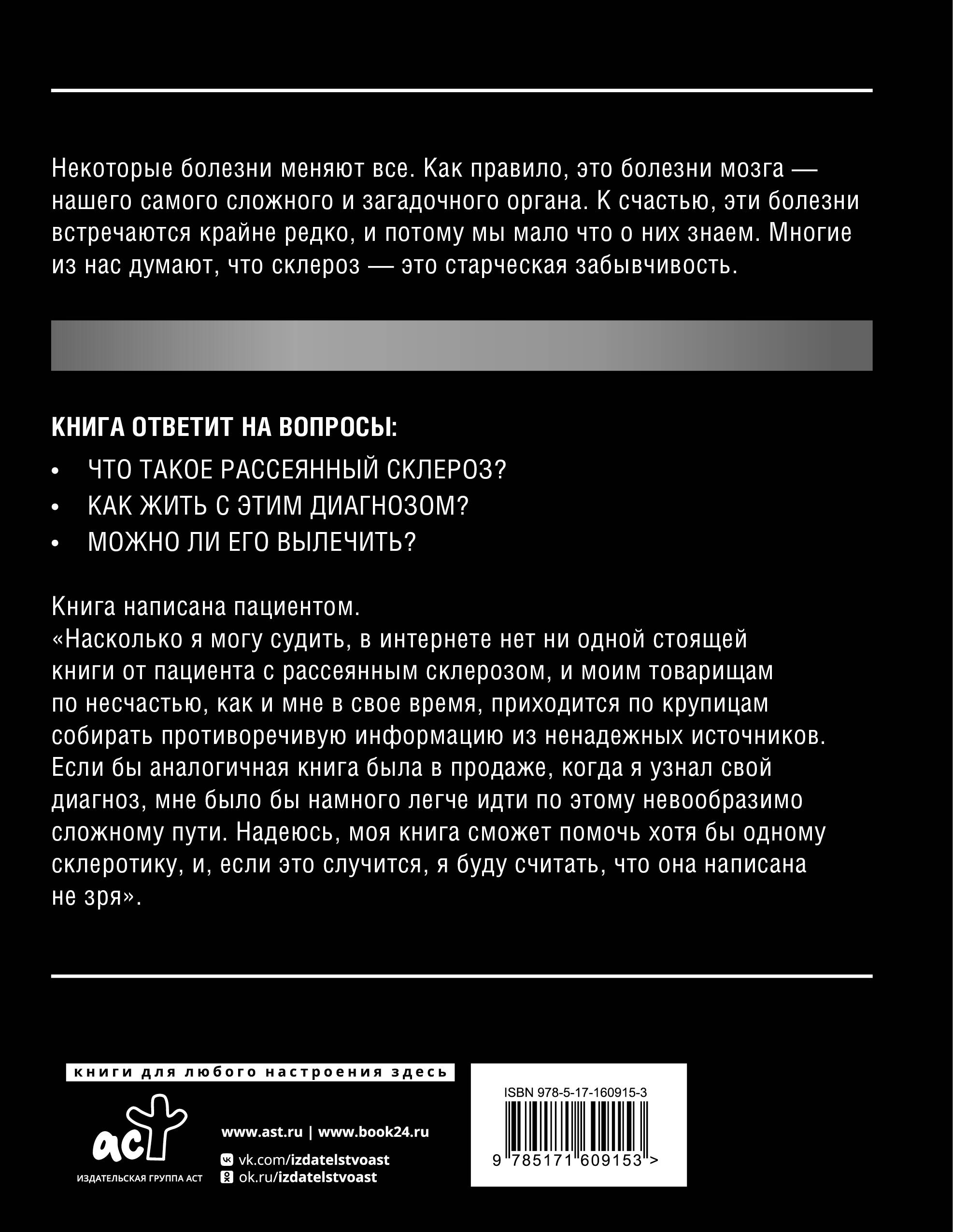 Некоторые болезни меняют все. Как правило, это болезни мозга - нашего самого сложного и загадочного органа. К счастью, эти болезни встречаются крайне редко, и потому мы мало что о них знаем. Многие из нас думают, что склероз - это старческая забывчивость. Книга ответит на вопросы: • Что такое "рассеянный склероз"? • Как жить с этим диагнозом? • Можно ли его вылечить? Книга написана пациентом. "Насколько я могу судить, в интернете нет ни одной стоящей книги от пациента с рассеянным склерозом, и моим товарищам по несчастью, как и мне в свое время, приходится по крупицам собирать противоречивую информацию из ненадежных источников. Если бы аналогичная книга была в продаже, когда я узнал свой диагноз, мне было бы намного легче идти по этому невообразимо сложному пути. Надеюсь, моя книга сможет помочь хотя бы одному склеротику, и, если это случится, я буду считать, что она написана не зря".| Издательство | Издательство "АСТ" |