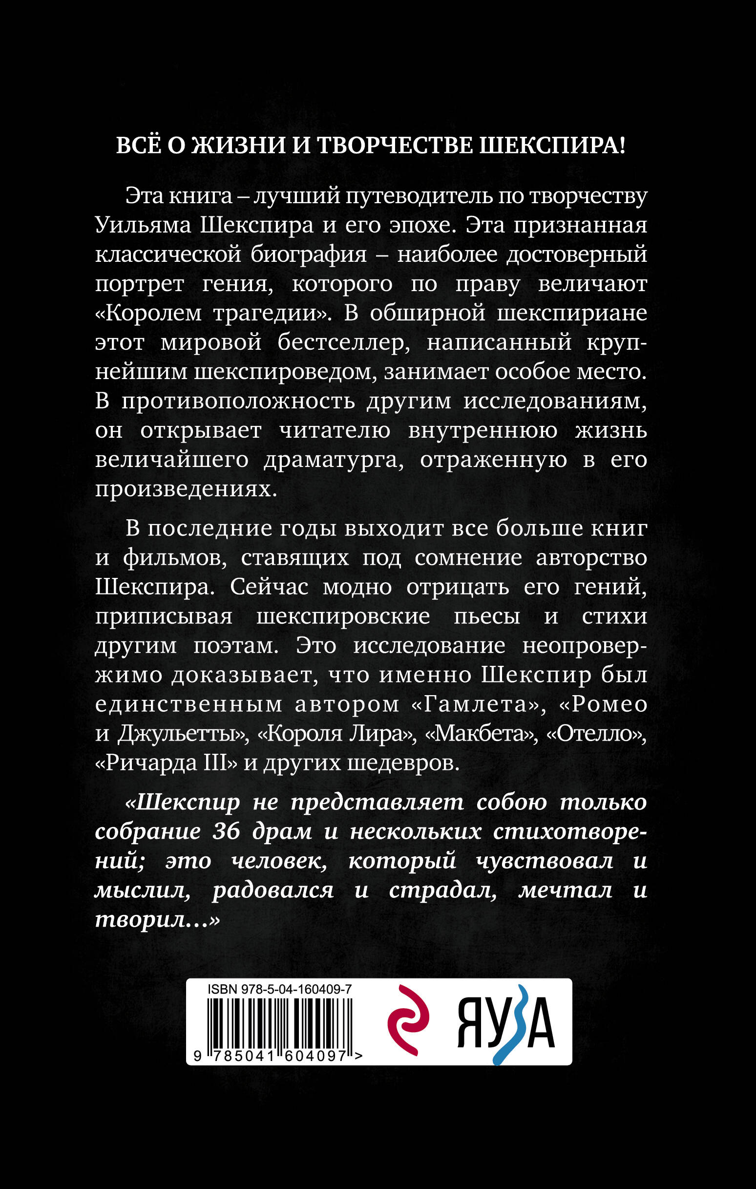 ВСЁ О ЖИЗНИ И ТВОРЧЕСТВЕ ШЕКСПИРА! Эта книга - лучший путеводитель по творчеству Уильяма Шекспира и его эпохе. Эта признанная классической биография - наиболее достоверный портрет гения, которого по праву величают «Королем трагедии». В обширной шекспириане этот мировой бестселлер, написанный крупнейшим шекспироведом, занимает особое место. В противоположность другим исследованиям, он открывает читателю внутреннюю жизнь величайшего драматурга, отраженную в его произведениях. В последние годы выходит все больше книг и фильмов, ставящих под сомнение авторство Шекспира. Сейчас модно отрицать его гений, приписывая шекспировские пьесы и стихи другим поэтам. Это исследование неопровержимо доказывает, что именно Шекспир был единственным автором «Гамлета», «Ромео и Джульетты», «Короля Лира», «Макбета», «Отелло», «Ричарда III» и других шедевров. «Шекспир не представляет собою только собрание 36 драм и нескольких стихотворений; это - человек, который чувствовал и мыслил, радовался и страдал, мечтал и творил…»| Издательство | ООО "Издательство "Эксмо" |