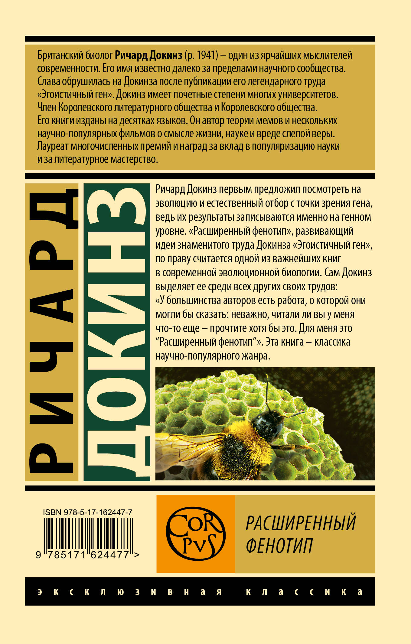 Ричард Докинз - крупный британский биолог, автор теории мемов. Его блестящие книги сыграли огромную роль в возрождении интереса к научно-популярной литературе. Ясность изложения, юмор и железная логика делают даже строго научные труды Докинза доступными широкому кругу читателей. "Расширенный фенотип" развивает идеи его знаменитой книги "Эгоистичный ген" (1976), где эволюция и естественный отбор рассматриваются "с точки зрения гена". Эти идеи, вызвавшие бурную полемику, уже прочно вошли в научный обиход, а "Расширенный фенотип" по праву считается одной из важнейших книг в современной эволюционной биологии.| Издательство | Издательство "АСТ" |