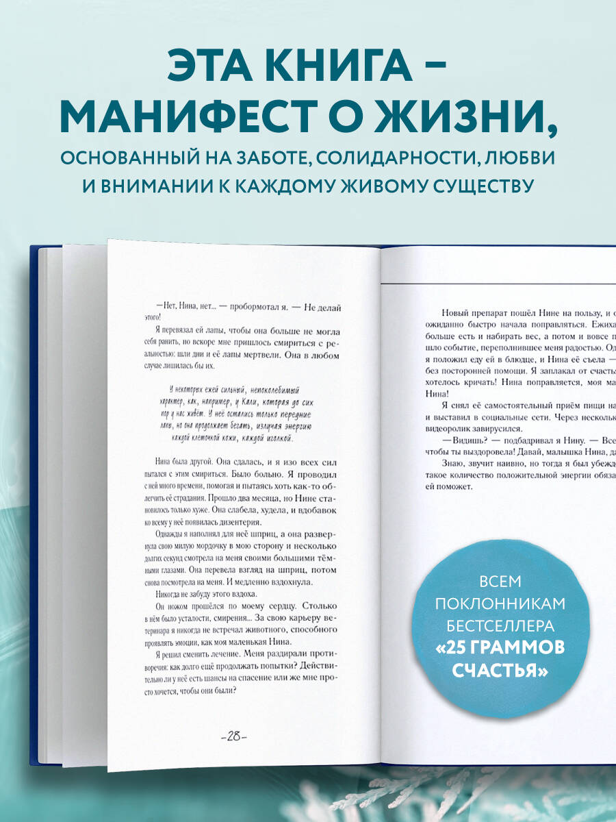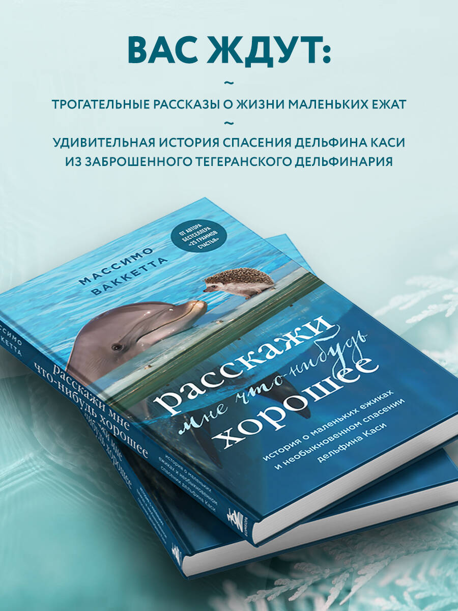Говорят, для того, чтобы исцелить свою душу, нужно помогать тем, кому гораздо хуже, чем тебе. Истории итальянского ветеринара о спасении маленьких ежиков покорили десятки тысяч людей по всему миру. В новой книге от автора бестселлера «25 граммов счастья. История маленького ежика, который изменил жизнь человека» вы найдете не только трогательные рассказы о жизни маленьких ежат, но и удивительную историю спасения дельфина Каси из заброшенного тегеранского дельфинария. Потеряв свободу и своих сородичей, Кася умирала от тоски. С этого момента началась эпическая история вызволения дельфина, в котором участвовали добровольцы из Ирана, Италии, России и других стран. Итальянский ветеринар столкнулся с рядом трудностей, но, продолжая заботиться о своих маленьких подопечных, умело справился с решением непредвиденных обстоятельств в масштабной операции по спасению еще одной жизни. Эта книга - манифест о жизни, основанной на единственных ценностях, которые могут гарантировать нашему виду приемлемое будущее: доброте, солидарности, любви к самым хрупким и внимании к каждому живому существу.