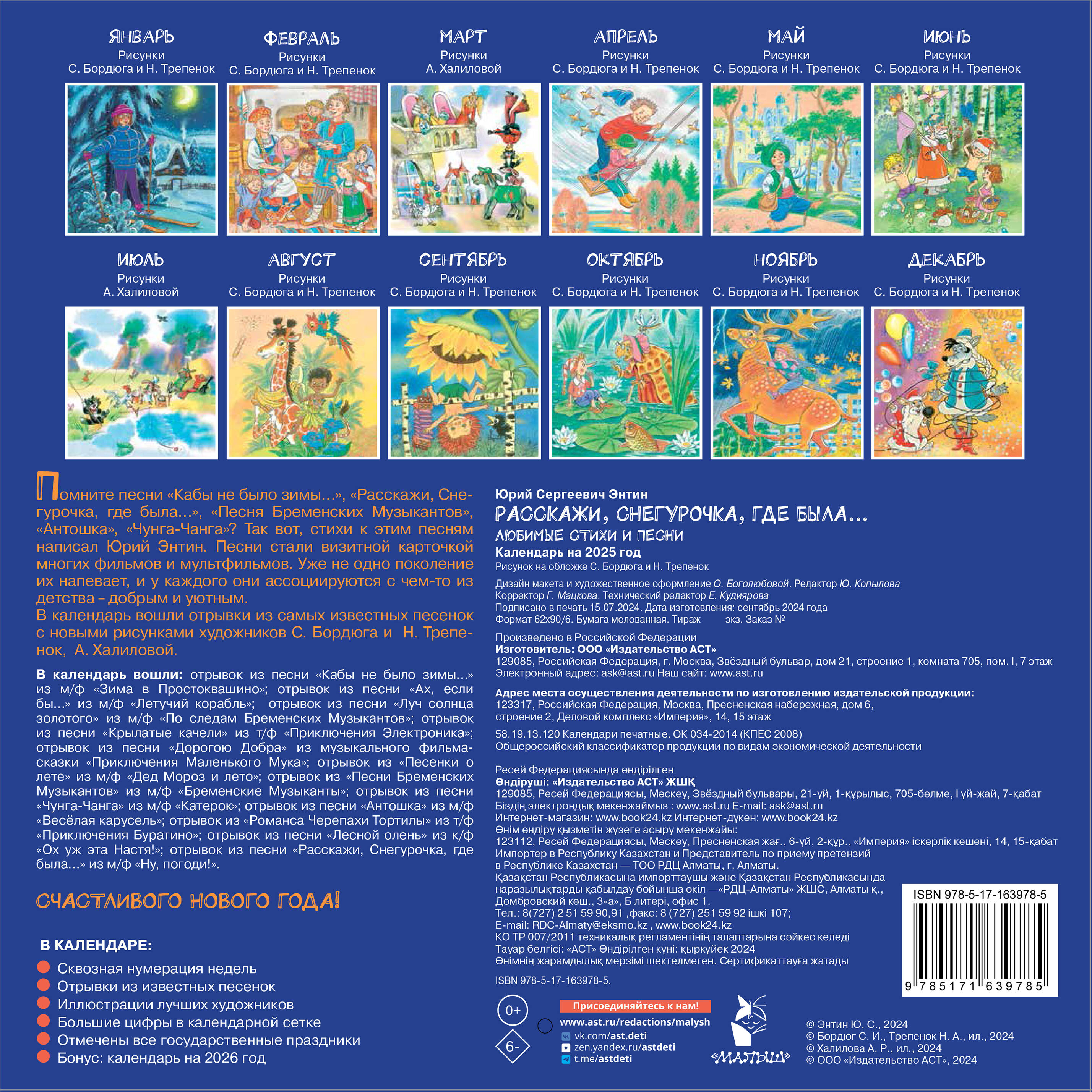 Знаете ли вы песенки «Расскажи, Снегурочка, где была…», «Кабы не было зимы…», «Вот оно какое, наше лето...», «Ничего на свете лучше нету…»? Так вот слова к этим песенкам написал поэт, сценарист и драматург Юрий Энтин. Песни звучат в полюбившихся многим мультфильмах «Ну, погоди!», «Зима в Простоквашино», «Дед Мороз и лето», «Бременские музыканты», «Летучий корабль» и многих других. Знакомые с детства, тексты этих песенок вошли в наш календарь. Рисунки С. Бордюга и Н. Трепенок, А. Халиловой.| Издательство | Издательство "АСТ" |