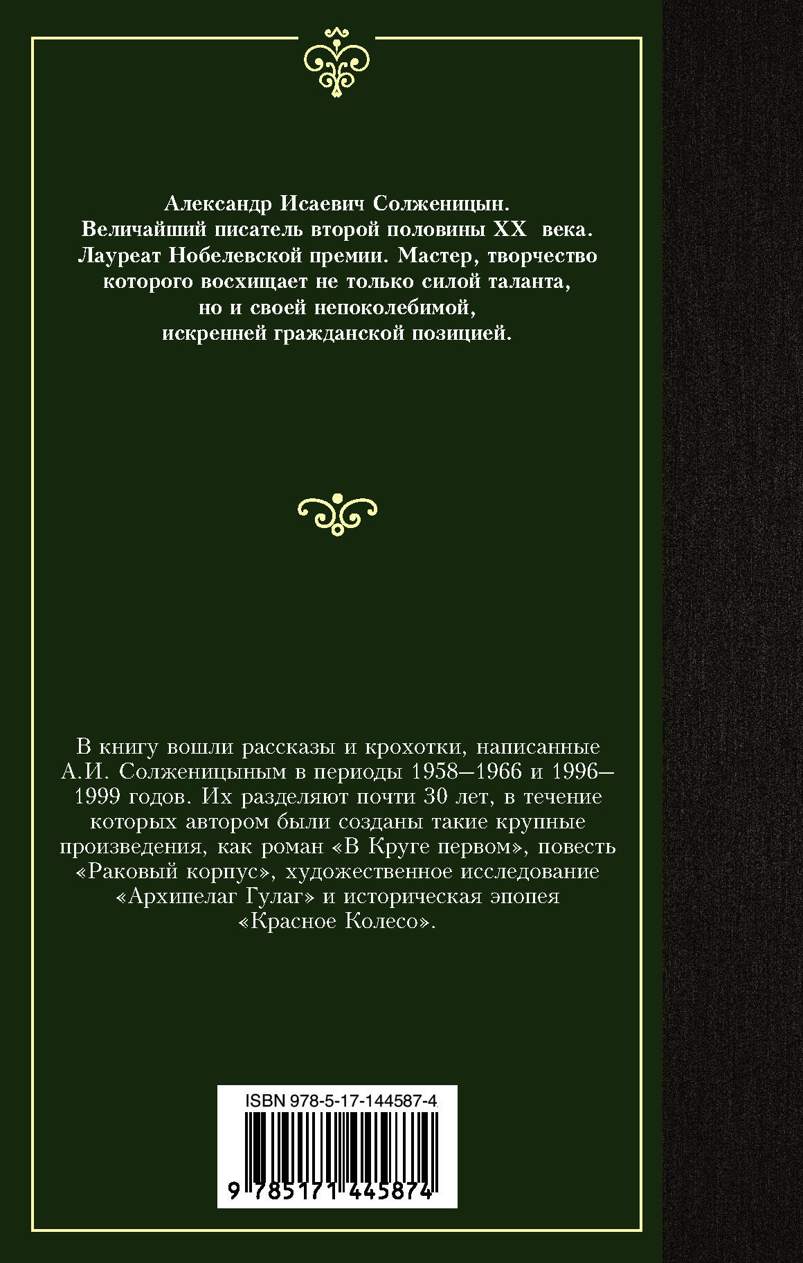 В книгу вошли рассказы и крохотки, написанные А.И. Солженицыным в периоды 1958-1966 и 1996-1999 годов. Их разделяют почти 30 лет, в течение которых автором были созданы такие крупные произведения, как роман "В Круге первом", повесть "Раковый корпус", художественное исследование "Архипелаг ГУЛАГ" и историческая эпопея "Красное Колесо".| Издательство | ИЗДАТЕЛЬСТВО "АСТ" |