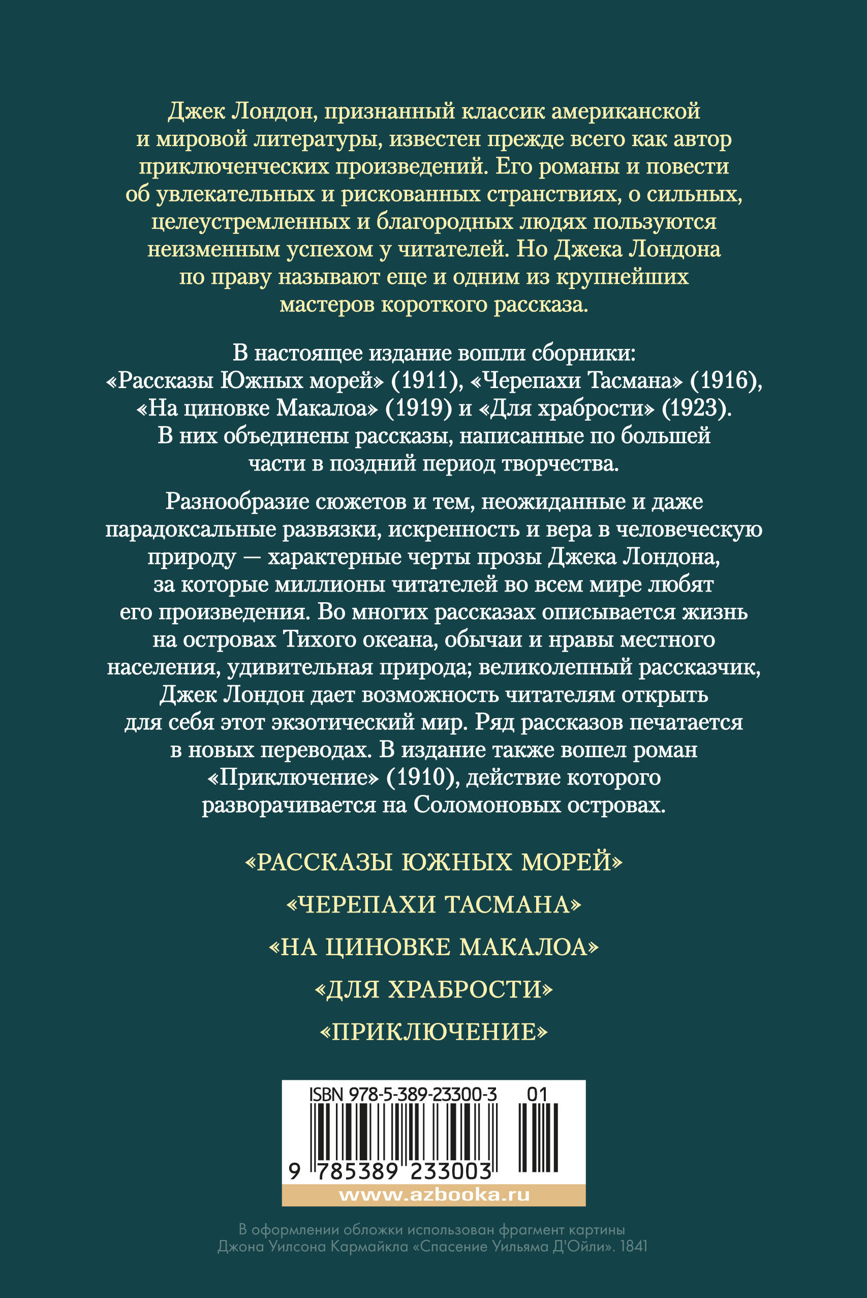 Настоящее издание представляет собой собрание рассказов Джека Лондона, признанного классика американской и мировой литературы. Он известен прежде всего как автор приключенческих романов и повестей об увлекательных и рискованных странствиях, о сильных, целеустремленных и благородных людях пользуются неизменным успехом у читателей. Но Джека Лондона по праву называют еще и одним из крупнейших мастеров короткого рассказа. В книгу вошли сборники: «Рассказы южных морей» (1911), «Черепахи Тасмана» (1916), «На циновке Макалоа» (1919) и «Для храбрости» (1923). В них объединены рассказы, написанные в поздний период творчества. Разнообразие сюжетов и тем, неожиданные и даже парадоксальные развязки, искренность и вера в человеческую природу - характерные черты прозы Джека Лондона, за которые миллионы читателей во всем мире любят его произведения. Во многих рассказах описывается жизнь на островах Тихого океана, обычаи и нравы местного населения, удивительная природа; великолепный рассказчик, Джек Лондон дает возможность читателям открыть для себя этот экзотический мир. Ряд рассказов печатается в новых переводах. В издание также вошел роман "Приключение" (1910), действие которого разворачивается на Соломоновых островах. Книга станет прекрасным подарком к любому празднику для поклонников приключенческой литературы.| Издательство | Издательство АЗБУКА ООО |