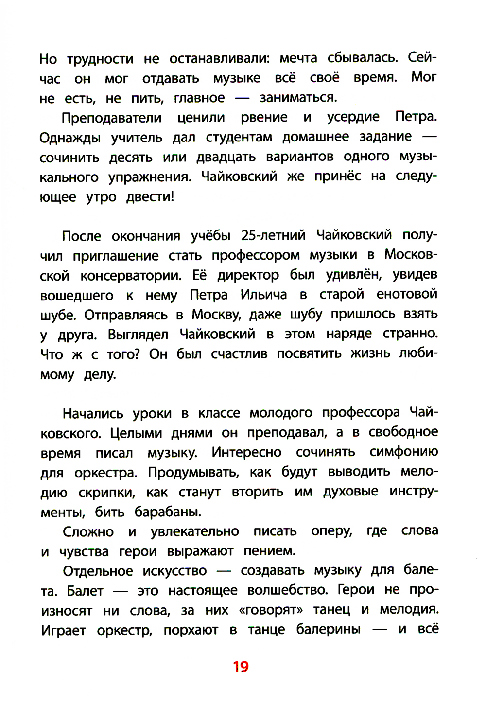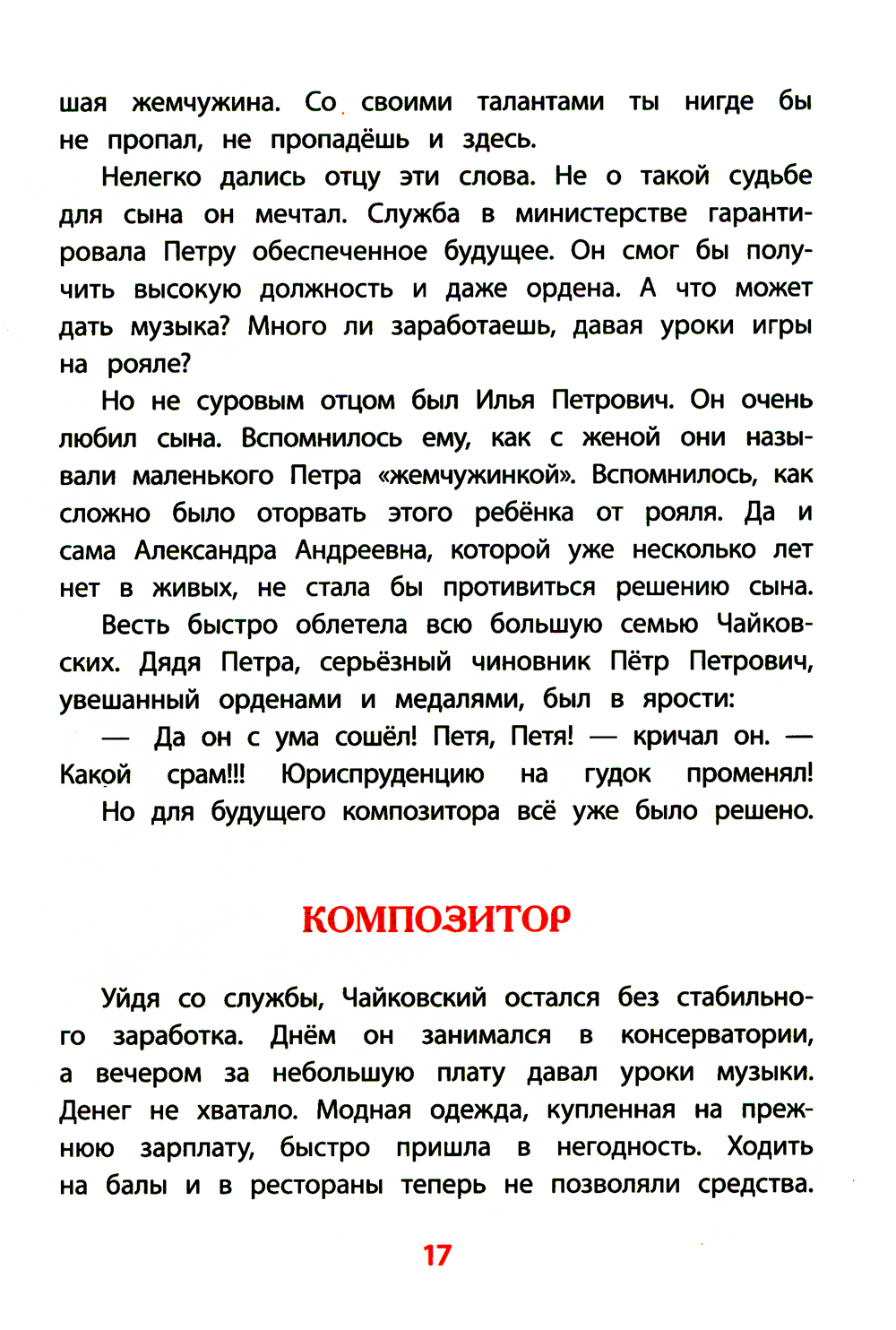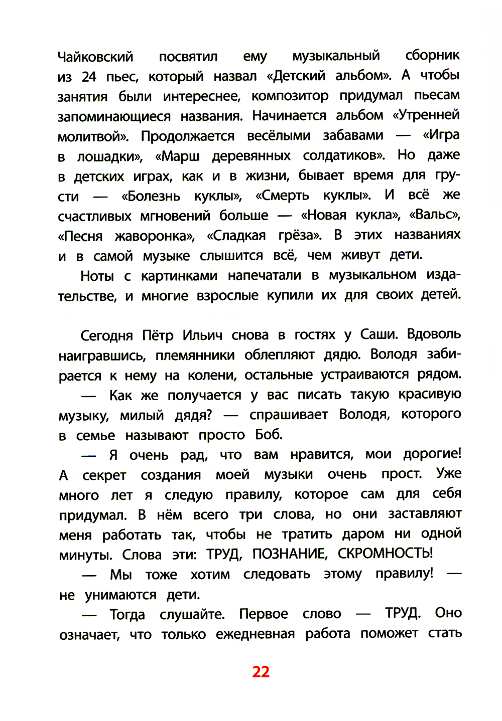 Сборник рассказов об одном из величайших композиторов мира - Петре Ильиче Чайковском. Вы узнаете о его детстве в небольшом уральском городке Воткинске, об учёбе в Санкт-Петербурге, о непростом пути к своей мечте - занятию музыкой. И, несомненно, о годах всемирного признания. По сей день музыка Чайковского остаётся символом русской культуры. Для младшего школьного возраста.| Издательство | Детская литература |