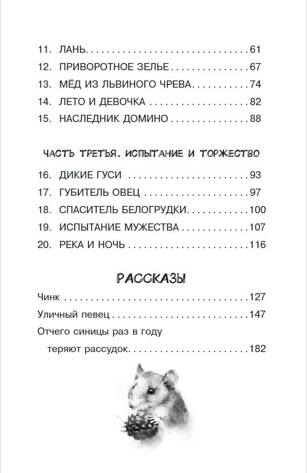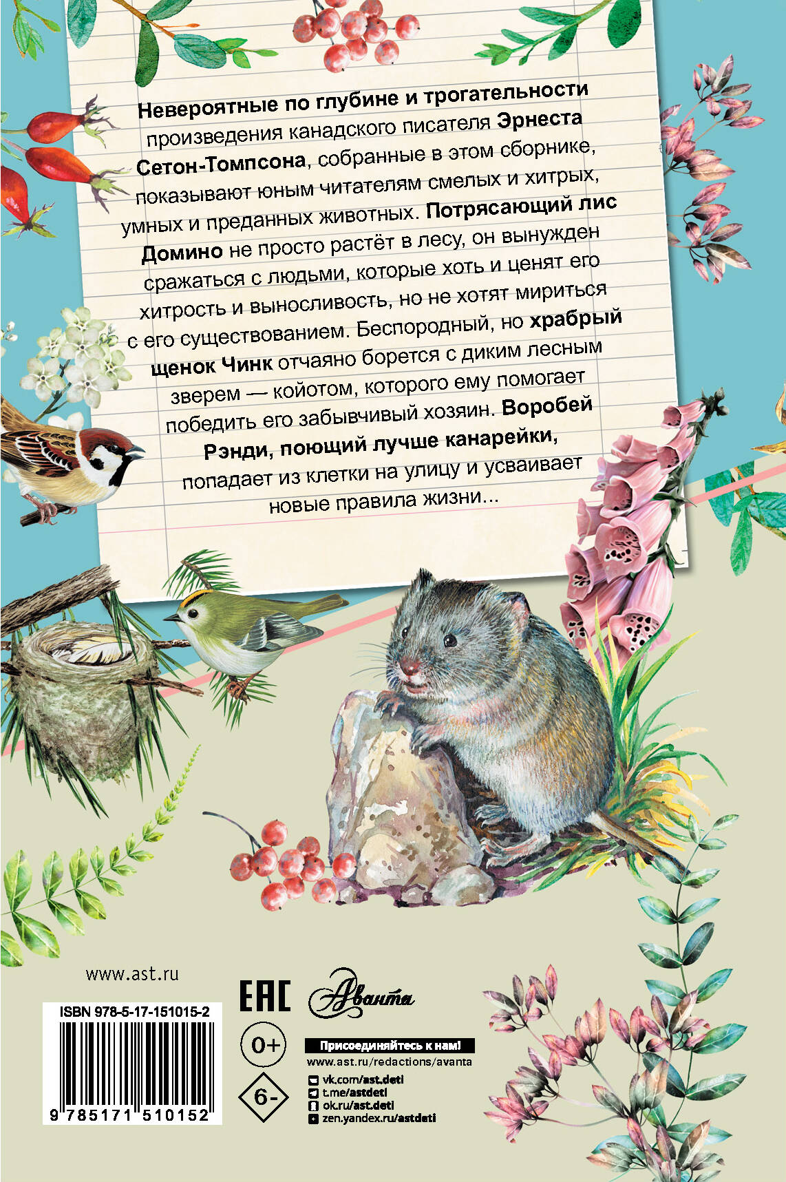 В сборник "Рассказы о природе" канадского писателя Э. Сетона-Томпсона вошли его лучшие произведения: о смелом и умном лисе Домино, о беспородном, но верном своему хозяину щенке Чинке, о воробье Рэнди, который и на улице, и в клетке пел не хуже канарейки... Для младшего и среднего школьного возраста. 4-ая сторонка Невероятные по глубине и трогательности произведения канадского писателя Эрнеста Сетон-Томпсона, собранные в этом сборнике, показывают юным читателям смелых и хитрых, умных и преданных животных. Потрясающий лис Домино не просто растёт в лесу, он вынужден сражаться с людьми, которые хоть и ценят его хитрость и выносливость, но не хотят мириться с его существованием рядом с их жилищами и стадами. Беспородный, но храбрый щенок Чинк вынужден бороться с диким лесным зверем - койотом, которого ему помогает победить его забывчивый хозяин. Воробей Рэнди, поющий лучше канарейки, попадает на улицу и усваивает новые правила...| Издательство | АСТ |