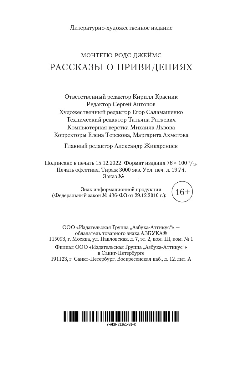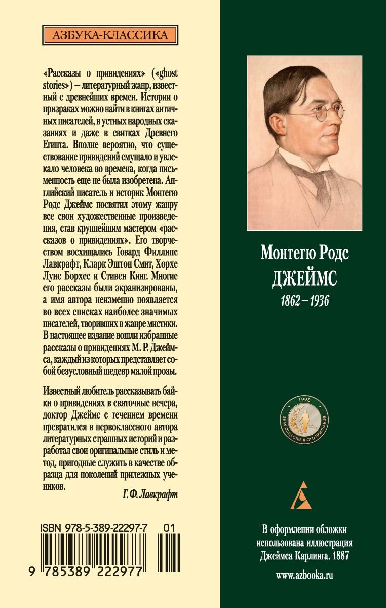 «Рассказы о привидениях» («ghost stories») - литературный жанр, известный с древнейших времен. Истории о призраках можно найти в книгах античных писателей, в устных народных сказаниях и даже в свитках Древнего Египта. Вполне вероятно, что существование привидений смущало и увлекало человека во времена, когда письменность еще не была изобретена. Английский писатель и историк Монтегю Родс Джеймс посвятил этому жанру все свои художественные произведения, став крупнейшим мастером «рассказов о привидениях». Его творчеством восхищались Говард Филлипс Лавкрафт, Кларк Эштон Смит, Хорхе Луис Борхес и Стивен Кинг. Многие его рассказы были экранизированы, а имя автора неизменно появляется во всех списках наиболее значимых писателей, творивших в жанре мистики. В настоящее издание вошли избранные рассказы о привидениях М. Р. Джеймса, каждый из которых представляет собой безусловный шедевр малой прозы.| Издательство | Азбука |