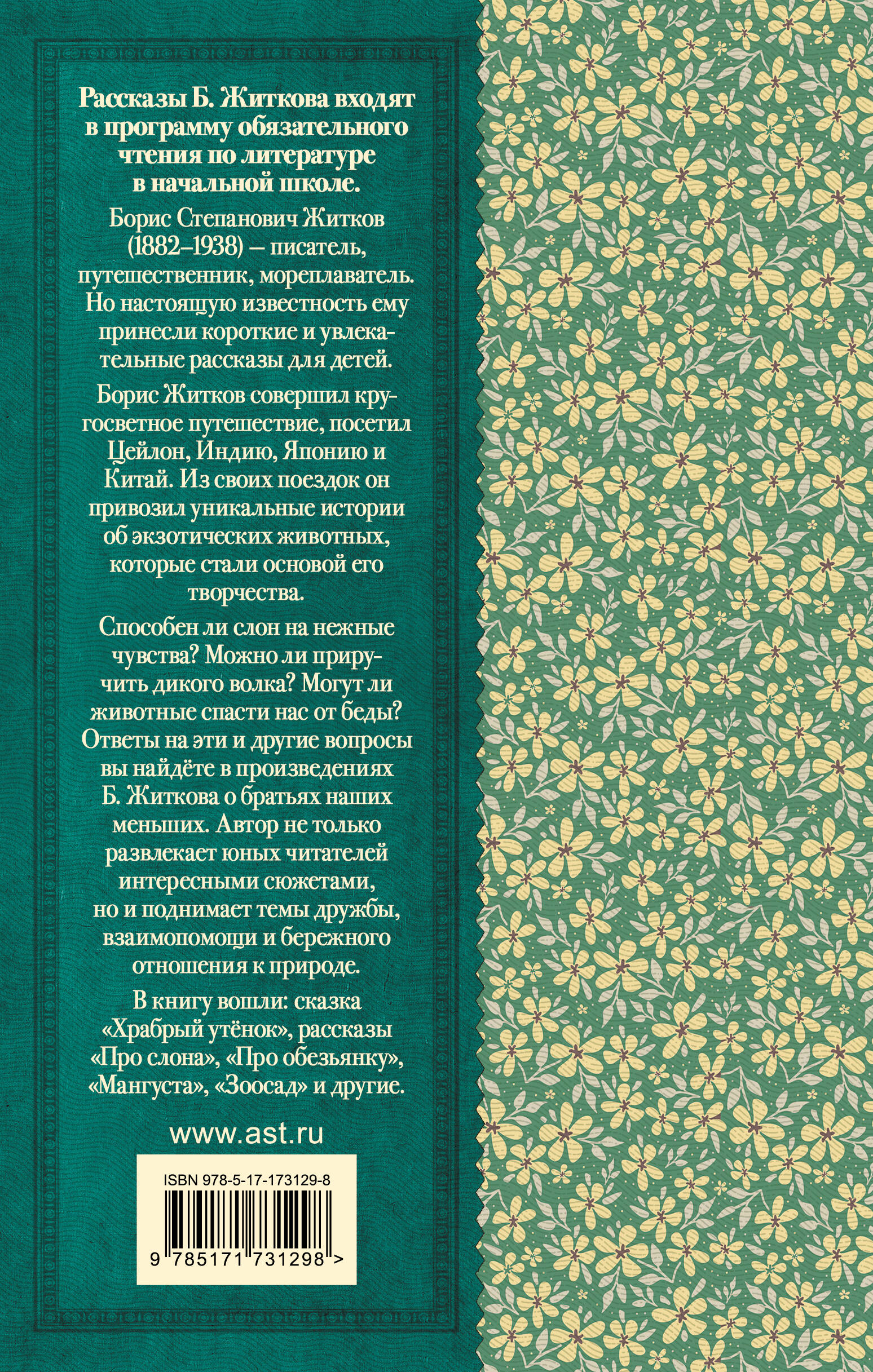 Рассказы Б. Житкова входят в программу обязательного чтения по литературе в начальной школе. Борис Степанович Житков (1882-1938) - писатель, путешественник, мореплаватель. Но настоящую известность ему принесли короткие и увлекательные рассказы для детей. Борис Житков совершил кругосветное путешествие, посетил Цейлон, Индию, Японию и Китай. Из своих поездок он привозил уникальные истории об экзотических животных, которые стали основой его творчества. Способен ли слон на нежные чувства? Можно ли приручить дикого волка? Могут ли животные спасти нас от беды? Ответы на эти и другие вопросы вы найдете в произведениях Б. Житкова о братьях наших меньших. Автор не только развлекает юных читателей интересными сюжетами, но и поднимает темы дружбы, взаимопомощи и бережного отношения к природе. В книгу вошли: сказка "Храбрый утёнок", рассказы "Про слона", "Про обезьянку", "Мангуста", "Зоосад" и другие.| Издательство | Издательство "АСТ" |