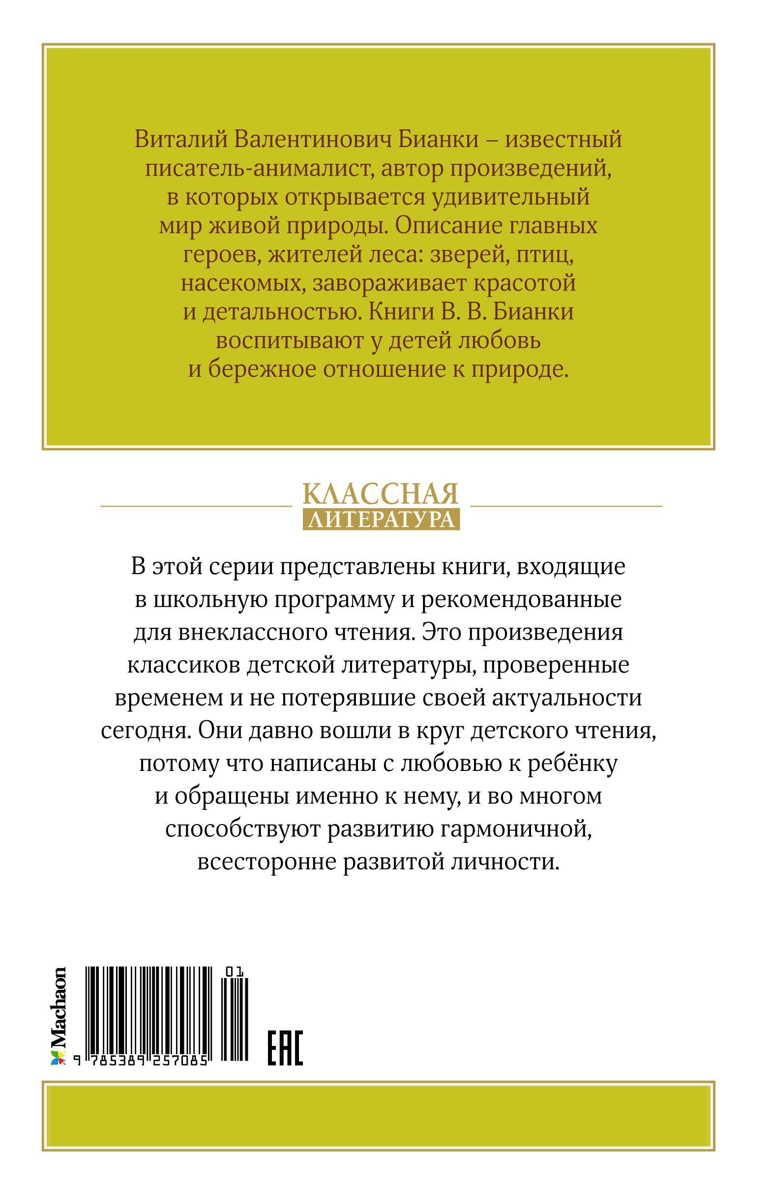 Виталий Валентинович Бианки - известный писатель-анималист, автор произведений, в которых открывается удивительный мир живой природы. Описание главных героев, жителей леса: зверей, птиц, насекомых, завораживает красотой и детальностью. Книги В. В. Бианки воспитывают у детей любовь и бережное отношение к природе.| Издательство | Азбука-Аттикус Издат.группа ООО |