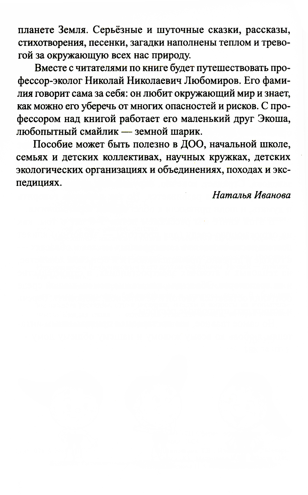 Экология сегодня - одна из важнейших наук, поэтому мы рассказываем о ней детям с раннего детства. Современные писатели и поэты в серьёзной и шуточной форме, доступной дошкольникам, знакомят читателей с проблемами окружающей среды и вместе с героями сборника - профессором-экологом Николаем Николаевичем Любомировым и его другом смайликом Экошей - думают, как их решить. Книга будет интересна широкому кругу читателей: педагогам, воспитателям, родителям, библиотекарям и, конечно, детям. В сборнике вы найдёте рассказы, стихи и сказки, загадки и вопросы на внимательность. Каждая глава - отдельная тема для беседы, которая поможет нам сообща заботиться о здоровье планеты.| Издательство | Творческий центр Сфера |