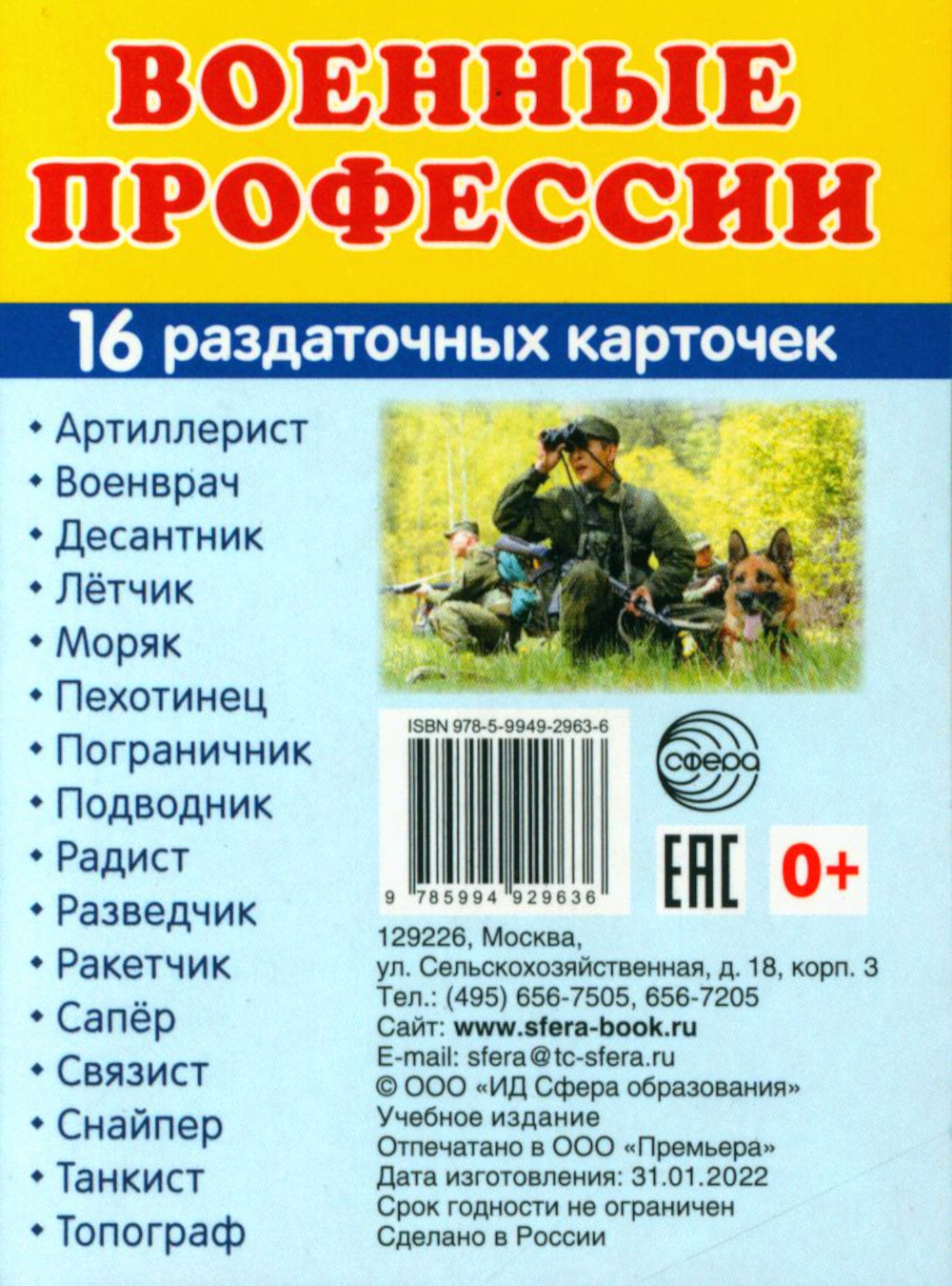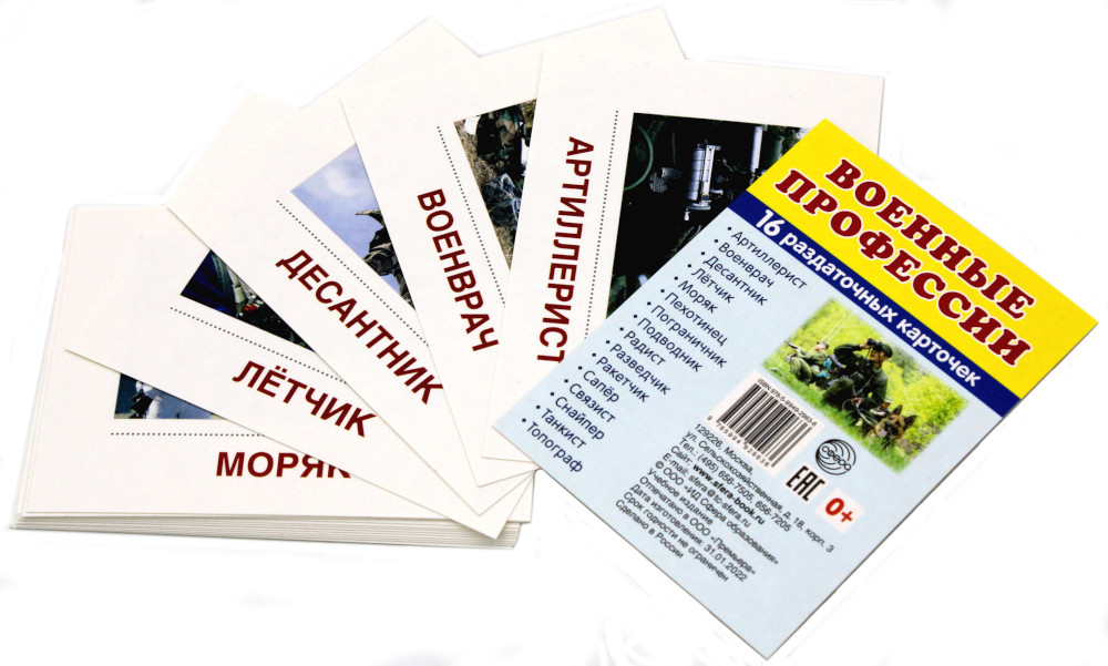 Комплект «Расскажем детям о защитниках России» состоит из двух раскрасок, комплекта демонстрационных материалов «Защитники России», двух методических пособий («Воинская слава России. Сборник сценариев к памятным датам и праздникам. Для детей 5-12 лет» и «Этих дней не смолкнет слава. Парциальная программа патриотического воспитания детей 5-7 лет»), двух комплектов тематических наглядных материалов («Военные профессии» и «Военная техника») и прилагающихся к ним двух комплектов из 16 раздаточных карточек.