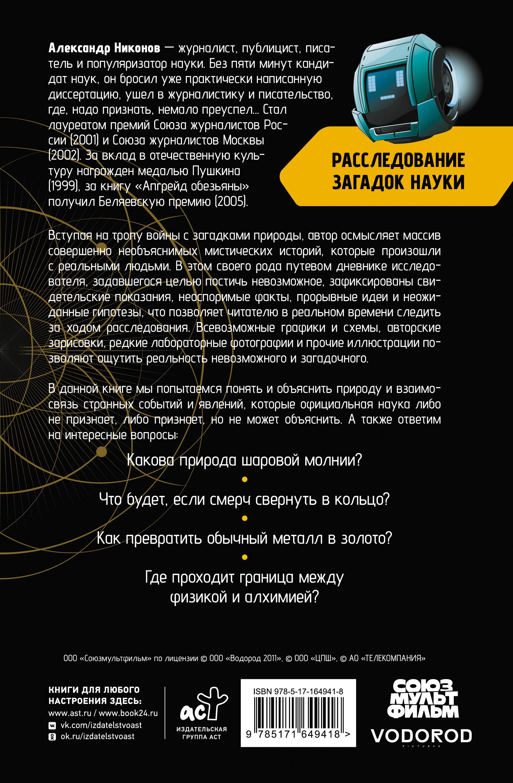 Известный журналист и автор множества научно-популярных изданий Александр Никонов в своей книге пытается понять природу и взаимосвязь странных событий и явлений, которые официальная наука либо не признает, либо признает, но не может объяснить. Какова природа шаровой молнии? Что будет, если смерч свернуть в кольцо? Как превратить обычный металл в золото? И где проходит граница между физикой и алхимией? Вступая на тропу войны с загадками природы, автор осмысляет массив совершенно необъяснимых мистических историй, которые произошли с реальными людьми. В этом своего рода путевом дневнике исследователя, задавшегося целью постичь невозможное, зафиксированы свидетельские показания, неоспоримые факты, прорывные идеи и неожиданные гипотезы, что позволяет читателю в реальном времени следить за ходом расследования. Всевозможные графики и схемы, авторские зарисовки, редкие лабораторные фотографии и прочие иллюстрации позволяют ощутить реальность невозможного и загадочного. Александр Никонов - журналист, публицист, писатель и популяризатор науки. Без пяти минут кандидат наук, он бросил уже практически написанную диссертацию, ушел в журналистику и писательство, где, надо признать, немало преуспел... Стал лауреатом премий Союза журналистов России (2001) и Союза журналистов Москвы (2002). За вклад в отечественную культуру награжден медалью Пушкина (1999), за книгу "Апгрейд обезьяны" получил Беляевскую премию (2005).| Издательство | Издательство "АСТ" |