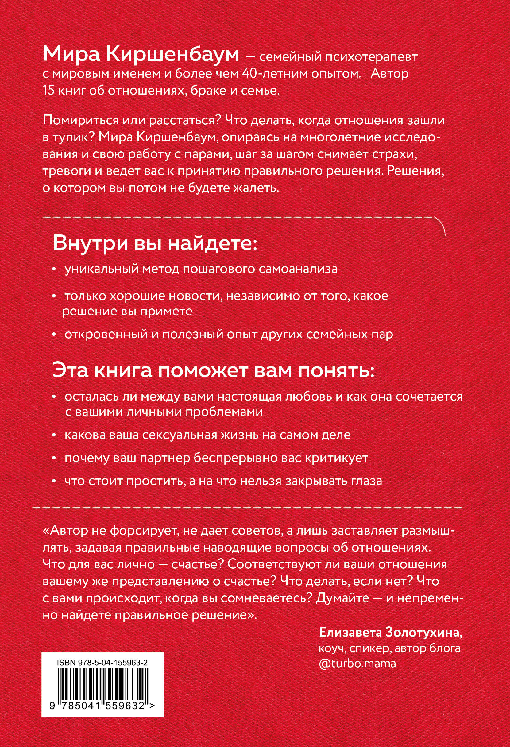 Мира Киршенбаум - семейный психотерапевт с мировым именем и более чем 40-летним опытом. Автор 15 книг об отношениях, браке и семье. Помириться или расстаться? Что делать, когда отношения зашли в тупик? Мира Киршенбаум, опираясь на многолетние исследования и свою работу с парами, шаг за шагом снимает страхи, тревоги и ведет вас к принятию правильного решения. Решения, о котором вы потом не будете жалеть. Внутри вы найдете: - уникальный метод пошагового самоанализа; - только хорошие новости, независимо от того, какое решение вы примете; - откровенный и полезный опыт других семейных пар. Эта книга поможет вам понять: - осталась ли между вами настоящая любовь и как она сочетается с вашими личными проблемами; - какова ваша сексуальная жизнь на самом деле; - почему ваш партнер беспрерывно вас критикует; - что стоит простить, а на что нельзя закрывать глаза. «Автор не форсирует, не даёт советов, а лишь заставляет размышлять, задавая правильные наводящие вопросы об отношениях. Что для вас лично - счастье? Соответствуют ли ваши отношения вашему же представлению о счастье? Что делать - если нет? Что с вами происходит, когда вы сомневаетесь? Думайте - и непременно найдете правильное решение». - Елизавета Золотухина, коуч, спикер, автор блога @turbo.mama