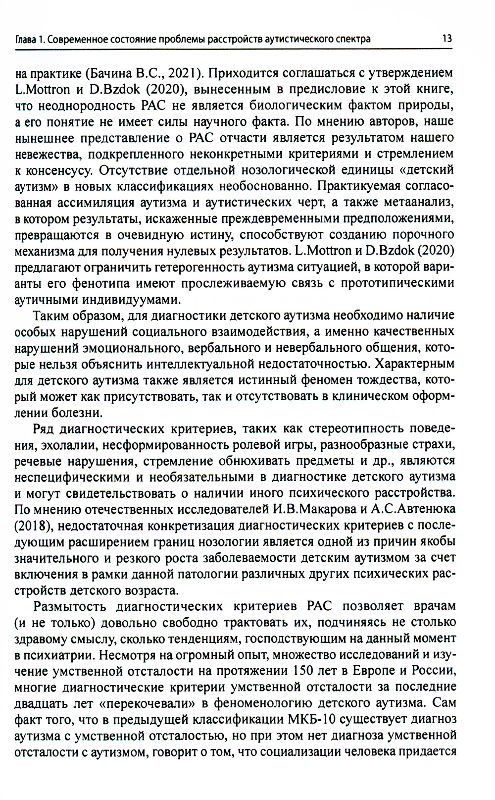 Проблема расстройств аутистического спектра в настоящее время является одной из наиболее изучаемых в детской психиатрии. Представления об аутизме научного сообщества и социума в целом претерпевают значительные изменения в очень быстром темпе, что находит отражение в существенном изменении разделов, посвященных этому расстройству, новых международных классификациях. Данная книга написана в русле идей и методов основоположника санкт-петербургской школы детской психиатрии профессора С.С.Мнухина об органической природе аутизма и нарушении работы аппаратов, ответственных за энергетическое обеспечение головного мозга. В монографии представлены современные данные об этиологии и патогенезе аутизма, рассматриваются его клинические проявления в поперечном и продольном разрезах, приводятся диагностические критерии расстройства аутистического спектра в соответствии с DSM-5 и МКБ-11. Большое внимание уделяется регрессивным формам психического развития, дифференциальной диагностике аутизма и умственной отсталости, ошибкам в диагностике. Проведен анализ современных методов лечения. Кроме того, учитывая тот факт, что некоторые проявления аутизма встречаются и у обычных детей, в монографию включена глава о нейротипичном развитии. Книга предназначена в первую очередь врачам-психиатрам, особенно детским, но будет интересна и широкому кругу специалистов разного профиля (врачам, психологам, тьюторам и т.д.), занимающихся проблемой расстройств аутистического спектра.| Издательство | МЕДпресс-информ |
