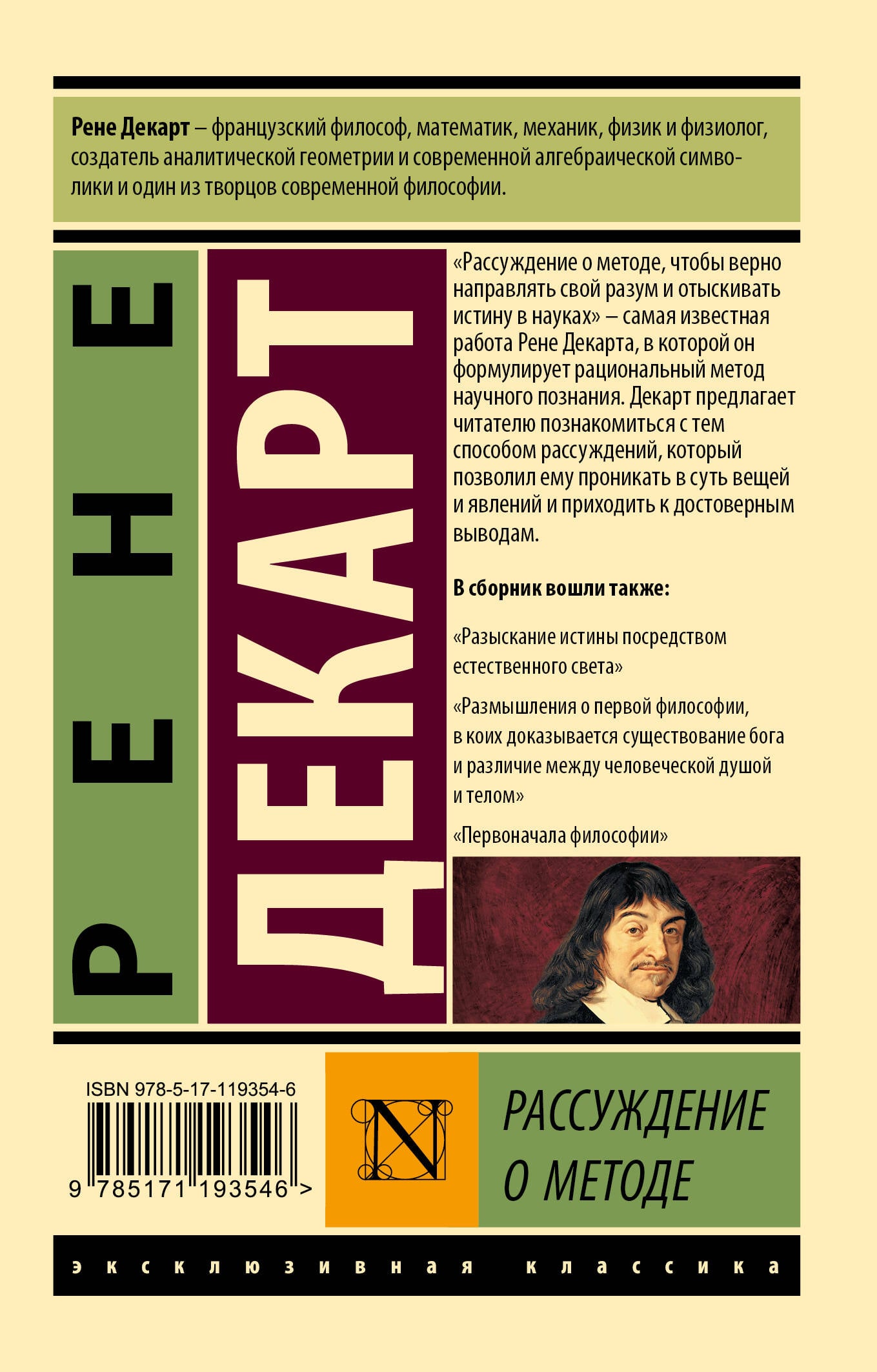 "Рассуждение о методе, чтобы верно направлять свой разум и отыскивать истину в науках" - самая известная работа Рене Декарта, в которой он формулирует рациональный метод научного познания. Декарт предлагает читателю познакомиться с тем способом рассуждений, который позволил ему проникать в суть вещей и явлений и приходить к достоверным выводам. В сборник вошли также: "Разыскание истины посредством естественного света" "Размышления о первой философии, в коих доказывается существование бога и различие между человеческой душой и телом" "Первоначала философии"| Издательство | ИЗДАТЕЛЬСТВО "АСТ" |