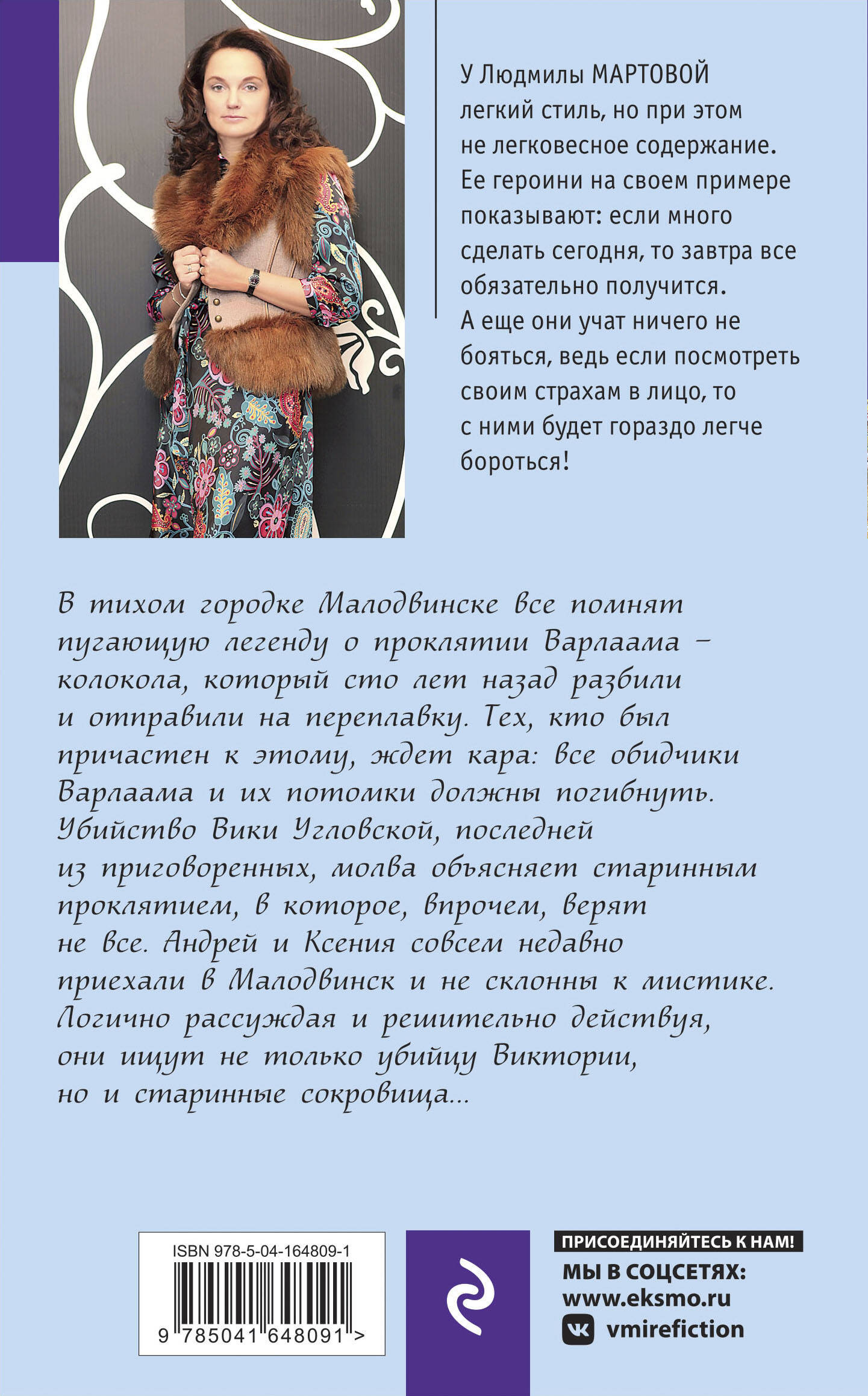 В тихом городке Малодвинске все помнят пугающую легенду о проклятии Варлаама - колокола, который сто лет назад разбили и отправили на переплавку. Тех, кто был причастен к этому, ждет кара: все обидчики Варлаама и их потомки должны погибнуть. Убийство Вики Угловской, последней из приговоренных, молва объясняет старинным проклятием, в которое, впрочем, верят не все. Андрей и Ксения совсем недавно приехали в Малодвинск и не склонны к мистике. Логично рассуждая и решительно действуя, они ищут не только убийцу Виктории, но и старинные сокровища… Увлекательность, легкий стиль, узнаваемые женские образы, лирические отступления, в которых автор делится своими мыслями о жизни и любви, делая некие обобщения и давая читателю советы, - отличительные черты романов Людмилы Мартовой. На фоне захватывающей детективной интриги автор в легкой доступной форме непринужденно разбирает непростые житейские ситуации, в которых может оказаться любая читательница, и ненавязчиво подсказывает пути выхода из них.| Издательство | Эксмо |