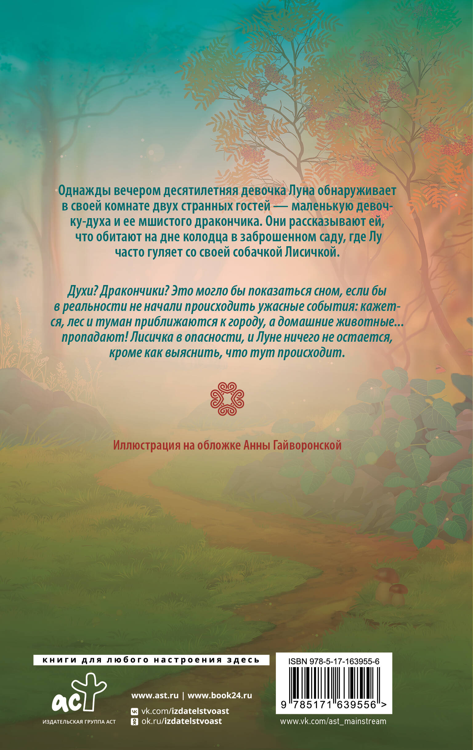 Однажды вечером десятилетняя девочка Луна обнаруживает в своей комнате двух странных гостей - маленькую девочку-духа и ее мшистого дракончика. Они рассказывают ей, что обитают на дне колодца в заброшенном саду, где Лу часто гуляет со своей собачкой - Лисичкой. Духи? Дракончики? Это могло бы показаться сном, если бы в реальности не начали происходить ужасные события: кажется, лес и туман приближаются к городу, а домашние животные... пропадают! Лисичка в опасности, и Луне ничего не остается, как выяснить, что тут происходит| Издательство | Издательство "АСТ" |