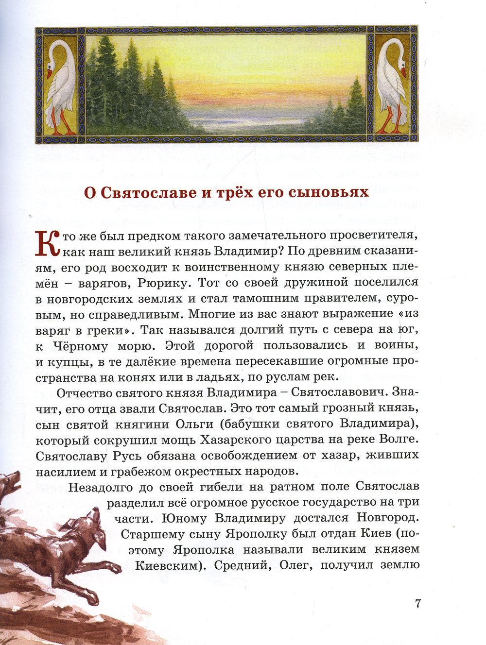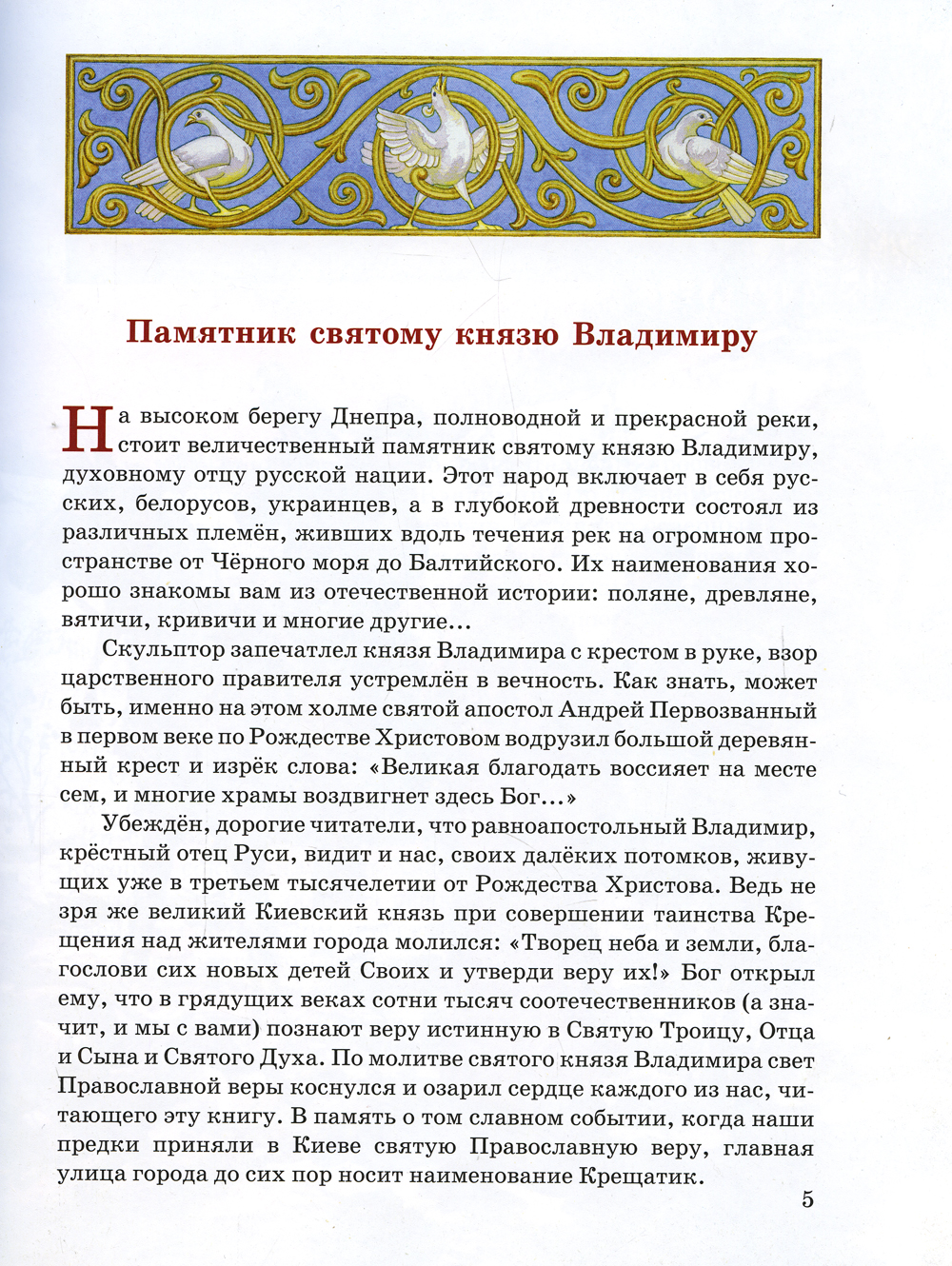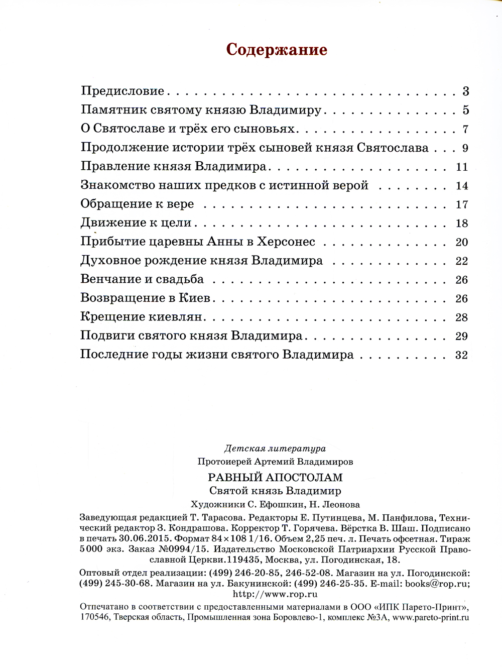 Эта книга написана для вас, наши маленькие, но смышлёные читатели. Прочитав её, вы узнаете, что духовным отцом русского народа является святой князь Владимир. Современным детям должно учиться у него любви к Святой Руси, готовности служить Отчизне не за страх, а за совесть, храня мир и любовь между собой, как это завещал своим сыновьям равноапостольный князь Владимир.