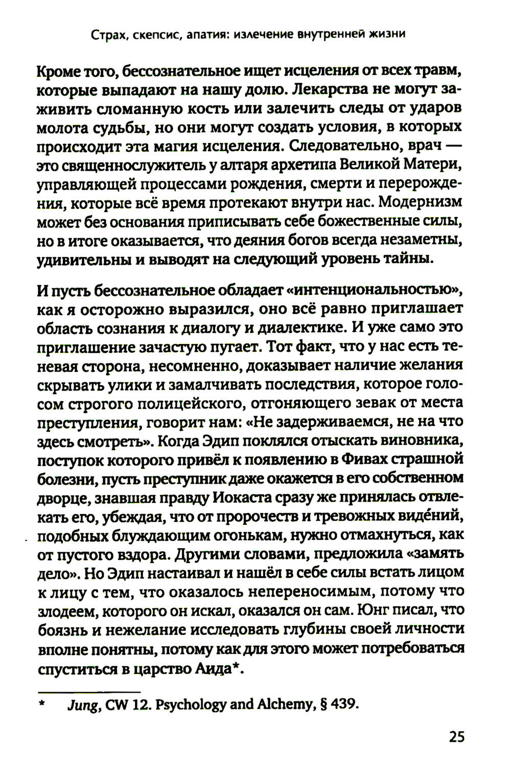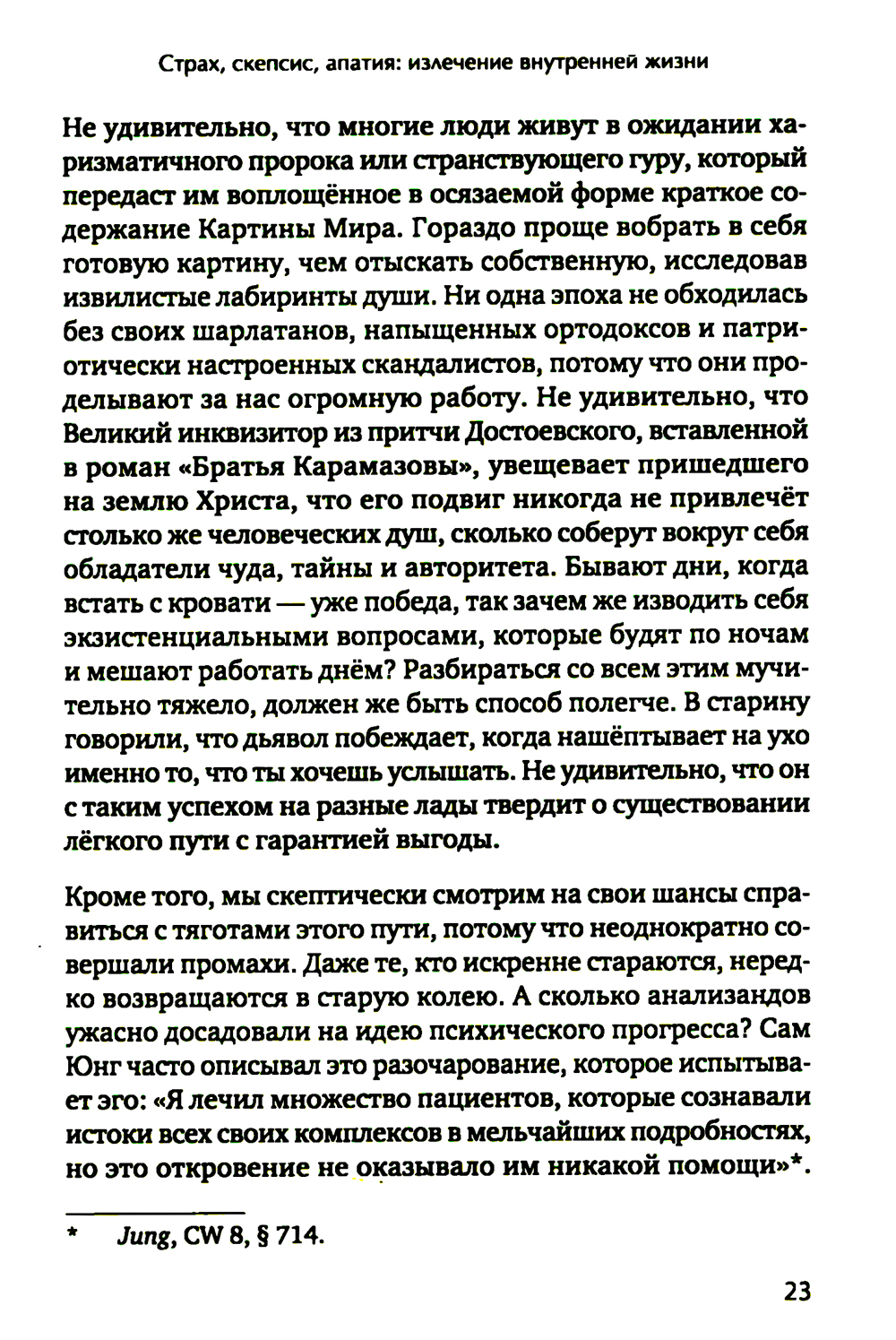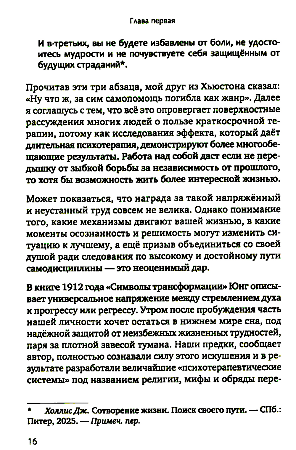 Выдающийся юнгианский аналитик исследует необходимость глубокою познания себя и многочисленные препятствия, стоящие на этом пути. Каждая глава иллюстрирует такие внутренние препятствия, например, запугивание себя масштабом проблемы, готовность избегать тяжёлой работы и грызущая неуверенность в себе, и также предоставляет инструменты для укренления сознания, необходимые для преодоления этих препятствий.| Издательство | Питер |