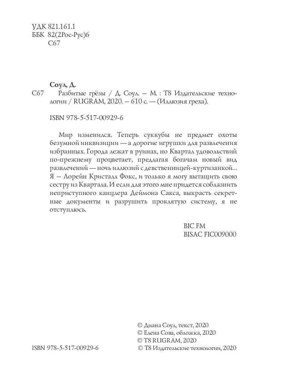 Мир изменился. Теперь суккубы не предмет охоты безумной инквизиции - а дорогие игрушки для развлечения избранных. Города лежат в руинах, но Квартал удовольствий по-прежнему процветает, предлагая богачам новый вид развлечений - ночь иллюзий с девственницей-куртизанкой... Я - Лорейн Кристалл Фокс, и. только я могу вытащить свою сестру из Квартала, И если для этого мне придется соблазнить неприступного канцлера Деймона Сакса, выкрасть секретные документы и разрушить проклятую систему, я не отступлюсь.| Издательство | Т8 RUGRAM |