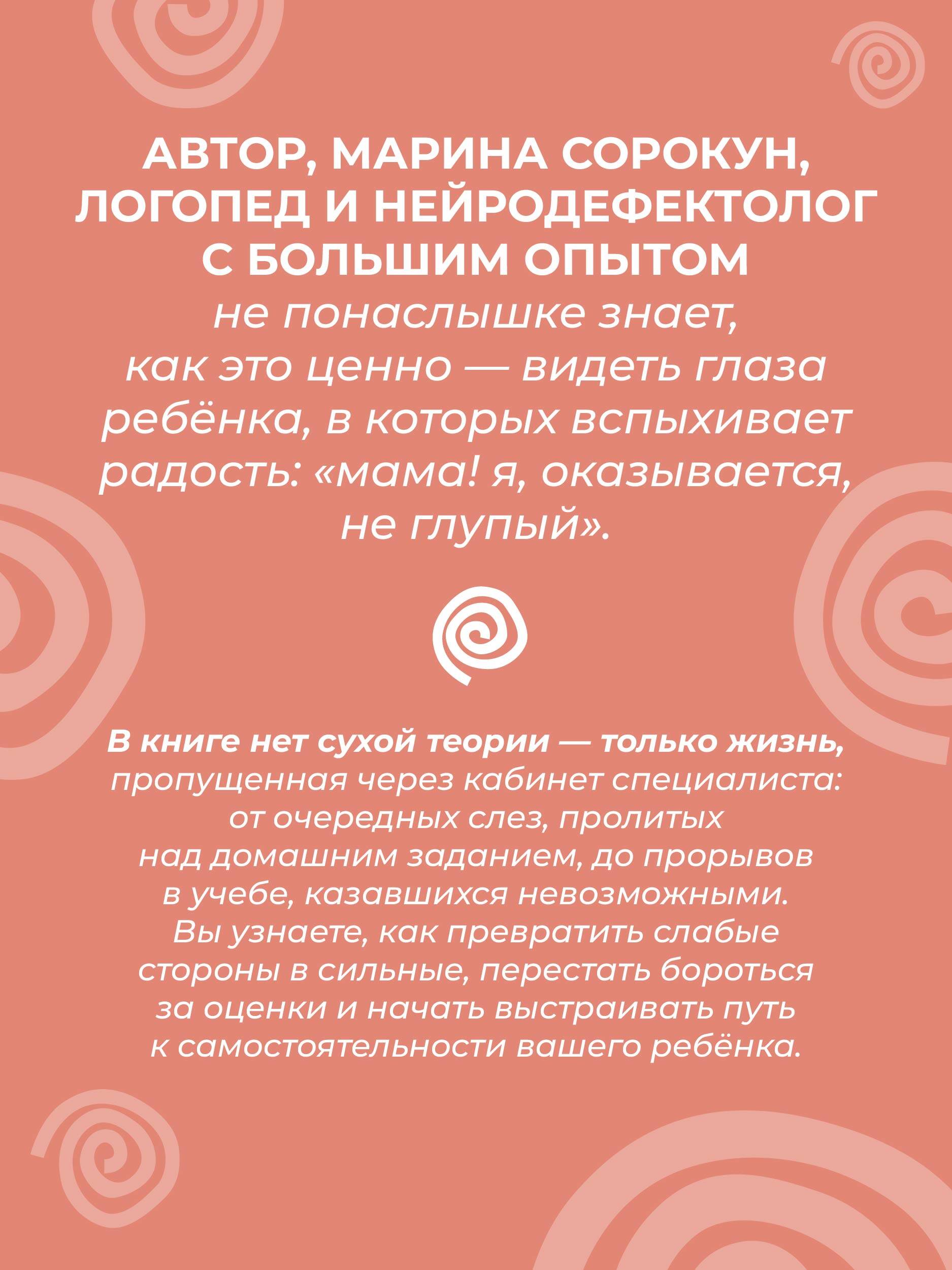 Марина Сорокун - логопед, нейродефектолог, автор уникального курса по разносторонней работе мозга "Нейрогимнастика". В своей книге автор приводит важные доводы и рассказывает читателю простым, можно сказать дружеским, языком, что "безнадёжных" детей не бывает, а бывают неподходящие методы поддержки и коррекции. Развенчивает мифы о "ленивых" и "неспособных" учениках, даёт научно обоснованные, но теплые и мотивирующие рекомендации, помогая сохранить уверенность и доверительные отношения с ребёнком. Эта книга - подробный путеводитель не только для начинающих специалистов, но и для родителей, чьи дети сталкиваются с трудностями чтения, письма или счёта: дислексией, дисграфией, дискалькулией, и, как следствие, - со школьной неуспеваемостью. На страницах книги вы узнаете: 1) как мозг ребёнка обрабатывает зрительную, слуховую и кинестетическую информацию 2) как отличить лень и нежелание от нейропсихологических особенностей. 3) как организовать коррекционную работу и встроить занятия в повседневную жизнь с удовольствием и пользой. 4) как разговаривать с ребёнком о его трудностях. 5) как правильно подобрать наиболее эффективные упражнения и игры, которые не только укрепляют навыки, но и формируют интерес к занятиям. "Пусть книга станет надёжной опорой тем, кто ищет реальные стратегии преодоления учебных барьеров и хочет вырастить успешного, счастливого ребёнка, верящего в свои силы" - Марина Сорокун.| Издательство | Издательство "АСТ" |