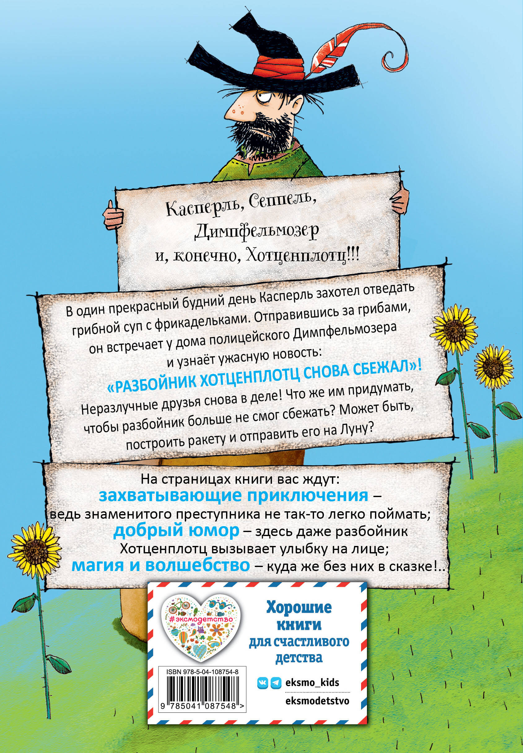 КАСПЕРЛЬ, СЕППЕЛЬ, ДИМПФЕЛЬМОЗЕР И, КОНЕЧНО, ХОТЦЕНПЛОТЦ!!! Офицер полиции Димпфельмозер в панике: Хотценплотц снова сбежал и разгуливает по округе, наводя ужас на мирных граждан. Неразлучные друзья Касперль и Сеппель вновь приходят на выручку офицеру и придумывают для поимки дерзкого разбойника нечто особенное, а именно - отправить преступника на Луну! Вы спросите: как? Конечно, построив для этого особенную ракету. Ведь с Луны Хотценплотц уже не сможет сбежать, не так ли? ОТФРИД ПРОЙСЛЕР (1923-2013) - известный немецкий писатель, признанный классик детской литературы, чьи книги переведены на 55 языков мира, а их суммарный тираж достигает 55 миллионов экземпляров!!! НЕМЕЦКИЙ СКАЗОЧНИК. Нет в России ребёнка, который не знал бы его волшебных историй о Маленькой Бабе Яге, Маленьком Водяном и Маленьком Привидении! Но на трёх сказках приключения и чудеса не заканчиваются! Познакомьтесь с неразлучными и отважными друзьями Касперлем и Сеппелем, мудрой бабушкой Касперля, с уважаемым офицером полиции Димпфельмозером и, конечно же, с грозой всей округи - неуловимым и смешным разбойником Хотценплотцем!