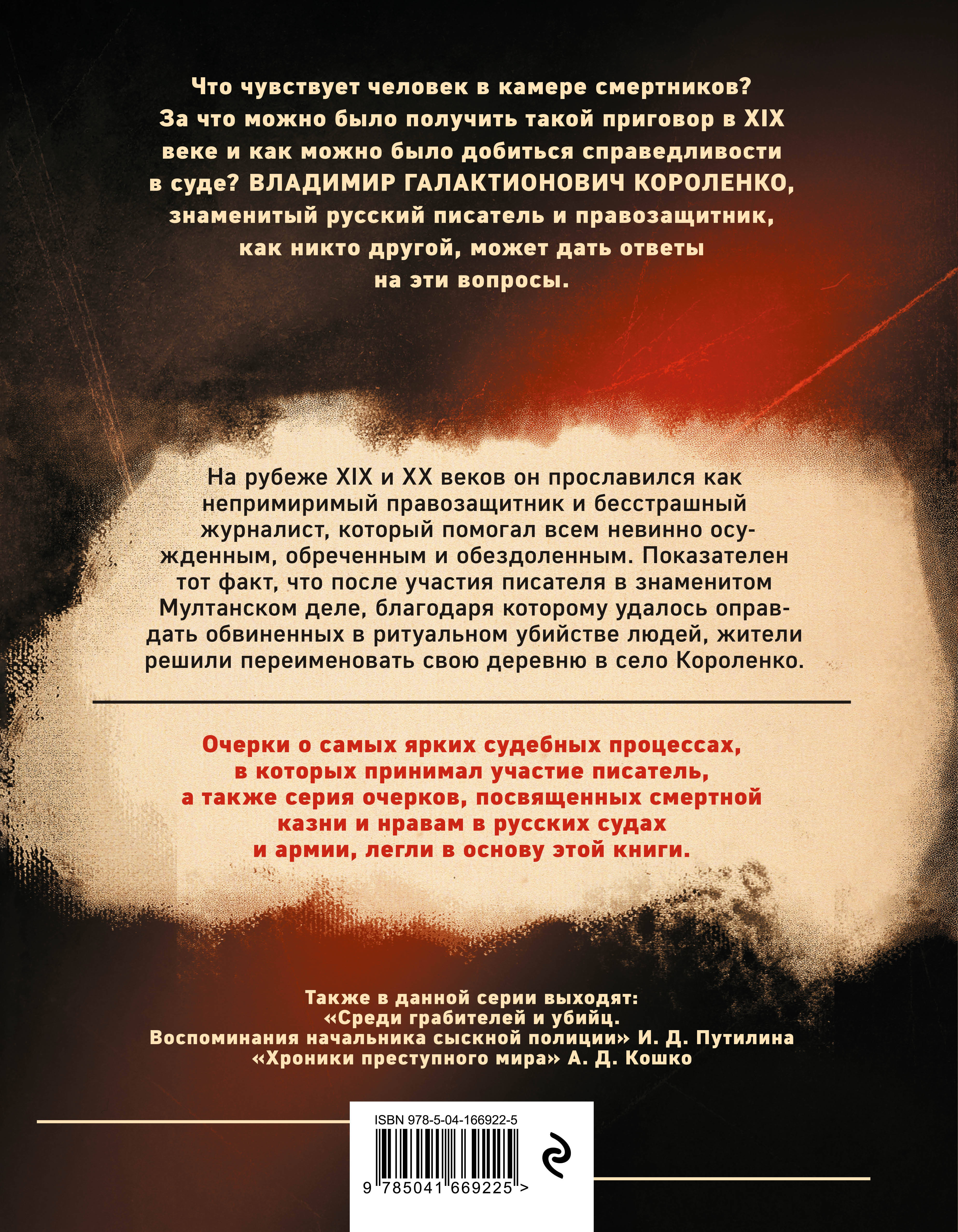 Владимир Галактионович Короленко - русский писатель, автор великого романа «В дурном обществе», прославился как один из первых специальных корреспондентов. На рубеже веков он всякий раз мчался по заданию редакции туда, где случается трагедия. Первое свое признание он получил как сторонник униженных, оскорбленных и несправедливо осужденных. Он выступал правозащитником в ряде сфабрикованных судебных процессов, открыто обличал проворовавшихся чиновников, пытки и казни в тюрьмах, выступал за гуманистические ценности. Очерки о самых громких делах, а также о нравах, царящих в суде, армии и тюрьмах, легли в основу этой книги. О нравах в русских тюрьмах, преступниках и преступлениях, невинно осужденных и рецидивистах, победах и поражениях в борьбе со злом и несправедливостью рассказывает эта книга.| Издательство | Эксмо |