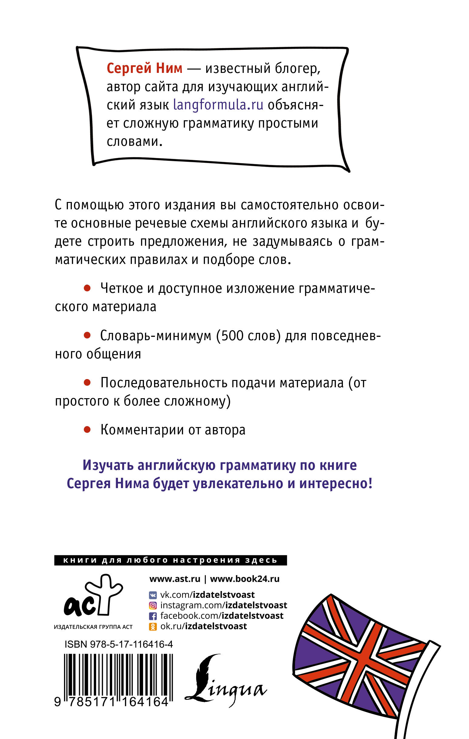 Сергей Ним (известный блогер, автор сайта для изучающих английский язык langformula.ru) представляет свою новую книгу «Разговорная грамматика английского языка». Особенности данного издания: • четкое и доступное изложение грамматического материала, что дает возможность освоить английский язык самостоятельно; • последовательность подачи материала (от простого к более сложному), у вас не возникнет трудностей с освоением материала; • уроки сгруппированы по типу предложений, что удобно для формирования четкого понимания грамматики иностранного языка; • каждый урок содержит схему, запомнив которую вы сможете построить множество предложений; • комментарии автора, позволяющие отследить современные тенденции английского языка и заметить разницу между британским и американским вариантом английского языка. Цели данного издания: • помочь самостоятельно освоить основные речевые схемы английского языка, • научиться использовать знакомые схемы в речи, строя предложения, • увлечь читателя и вызвать интерес к изучению английского языка.| Издательство | Издательство "АСТ" |